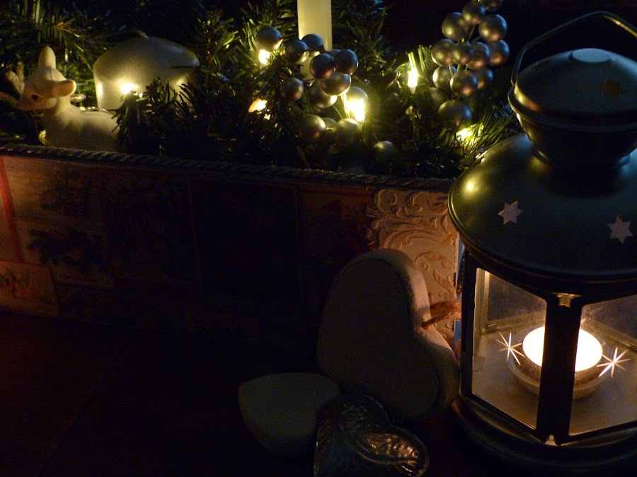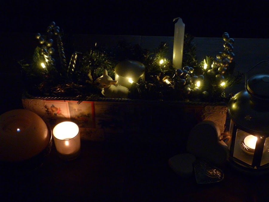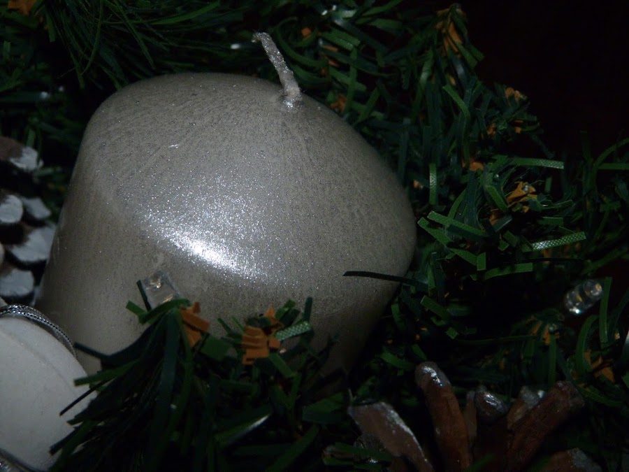 Después, una botellita de cristal con velas rizadas, una vela grande central... todo ello con las ramas de abeto como base y también distribuidas entre todos los demás elementos, y todo ello salpicado con las luces blancas de una guirnalda a pilas.