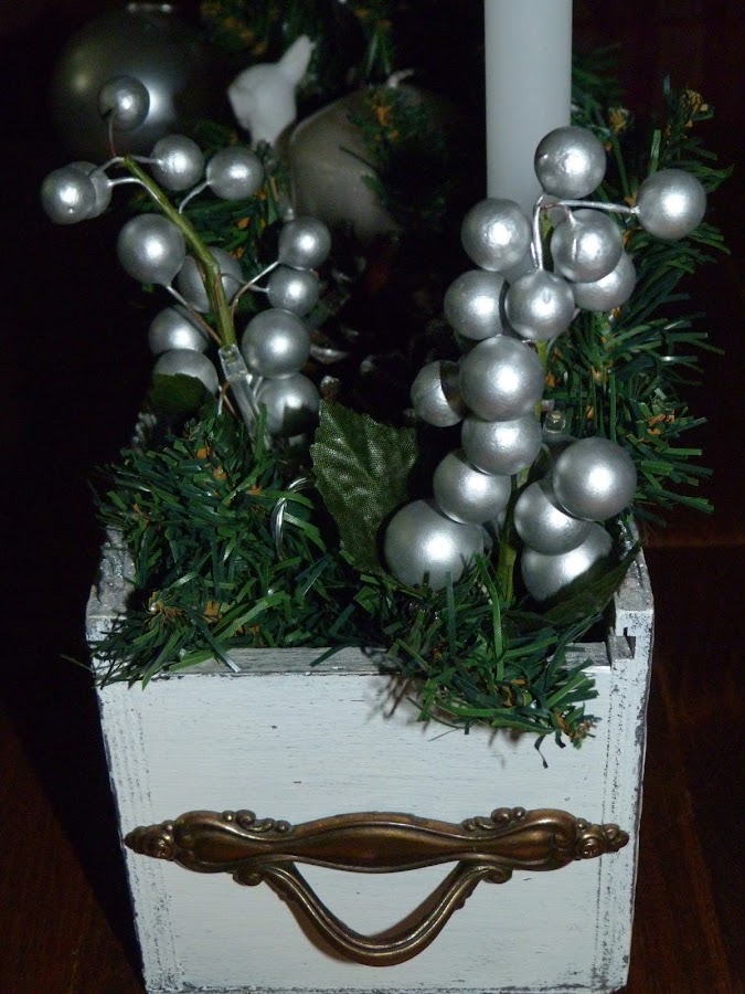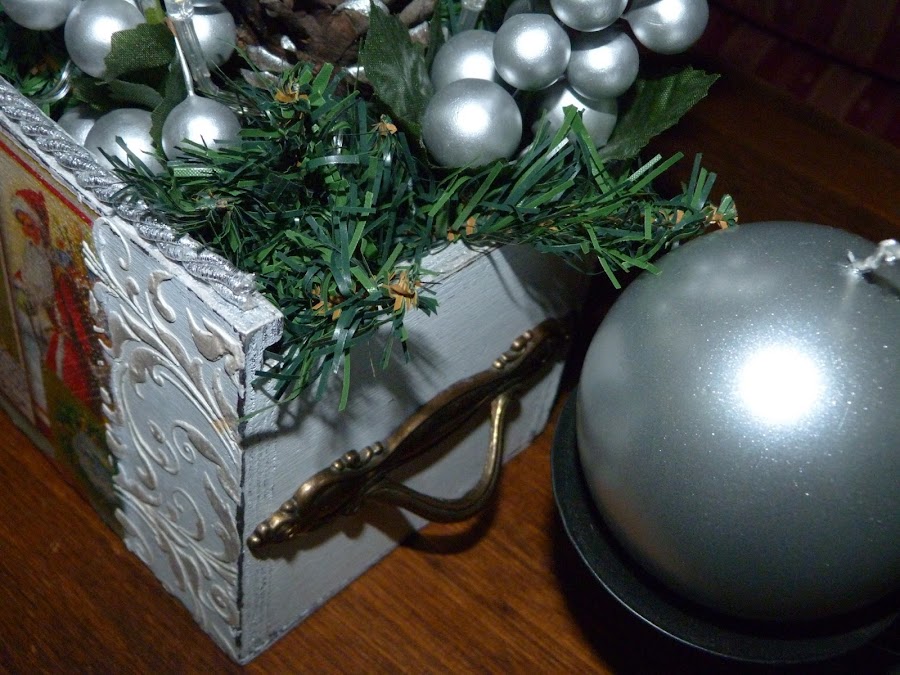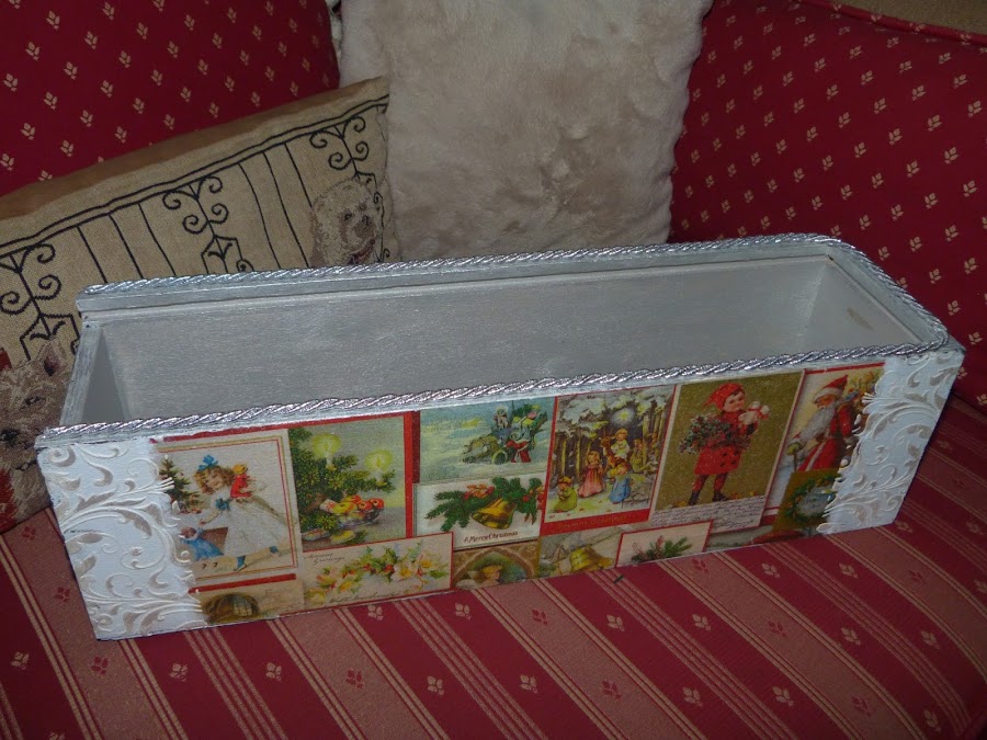 Empecé con un fondo color chocolate y pasándole una vela para después desgastar el blanco tiza con que la pinté. Después, decoupage con una preciosa servilleta con escenas navideñas vintage, integrada con toques de pintura blanca en los bordes. En las cuatro esquinas, estarcido en relieve y ligeramente sombreado en plata.