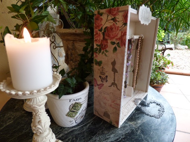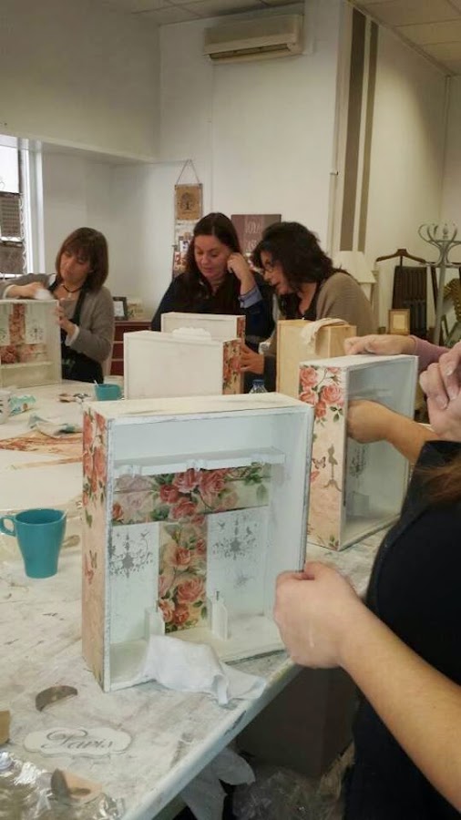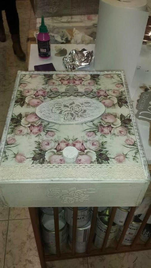 El taller de la tarde consistía en hacer esta otra caja con decoupage de servilleta, craquelado, estarcidos en relieve y pintados y encerado final