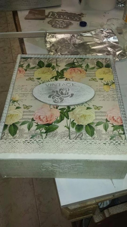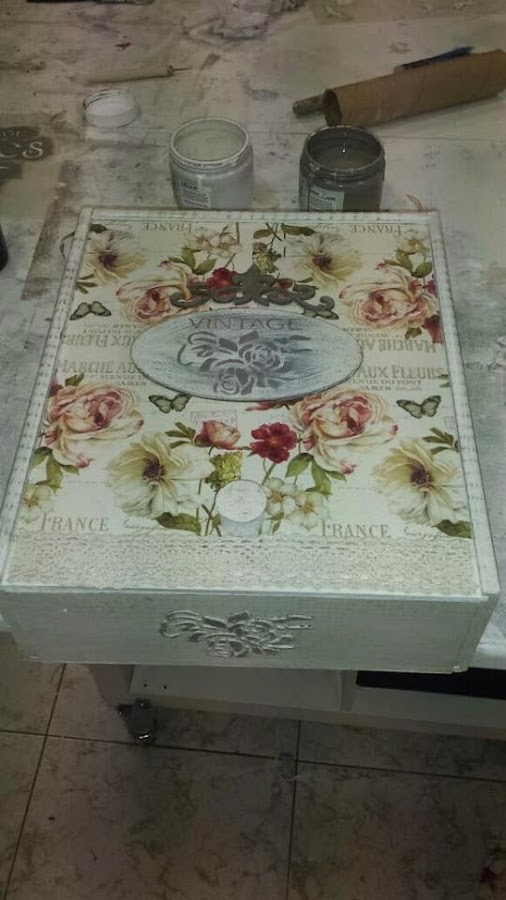 Lleva decapado en la tapa y laterales, decoupage con servilleta, craquelado en el frontal y estarcidos en relieve y pintados.