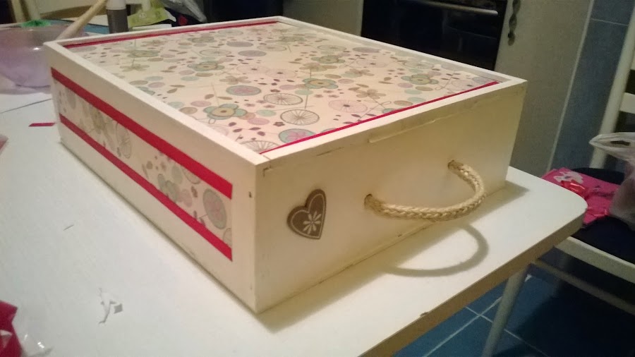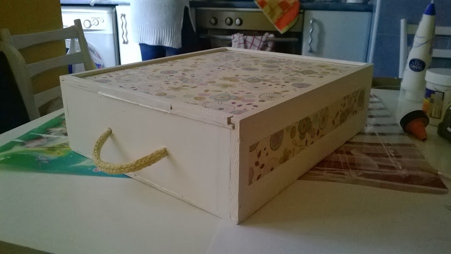 Tengo que decir que nunca había hecho un trabajo de este estilo y me lo tomé como un reto. Lo primero que pensé fue que esas letras había que taparlas, así que, pusimos imprimación por el exterior e interior, dejamos secar y dimos dos manos de pintura blanca acrilica, dejando secar bien entre capa y capa, mientras tanto elegimos un papel decorado de scrap y lo pegamos con cola blanca (cuando estaba bien seca la pintura)1 cm más pequeña que la tapa de la caja, para dejar un marco y pusimos unas tiras del mismo papel en cada lateral, así nos aseguramos que las letras quedan bien tapadas.