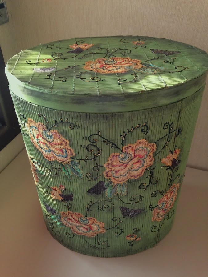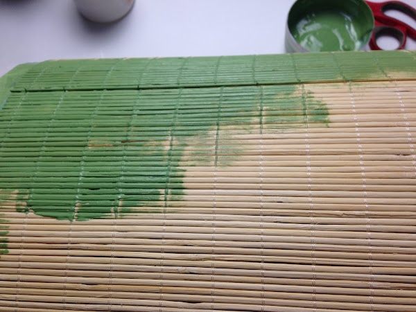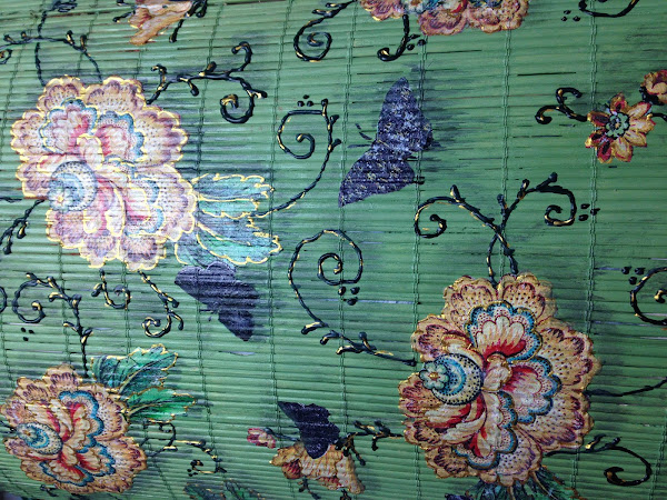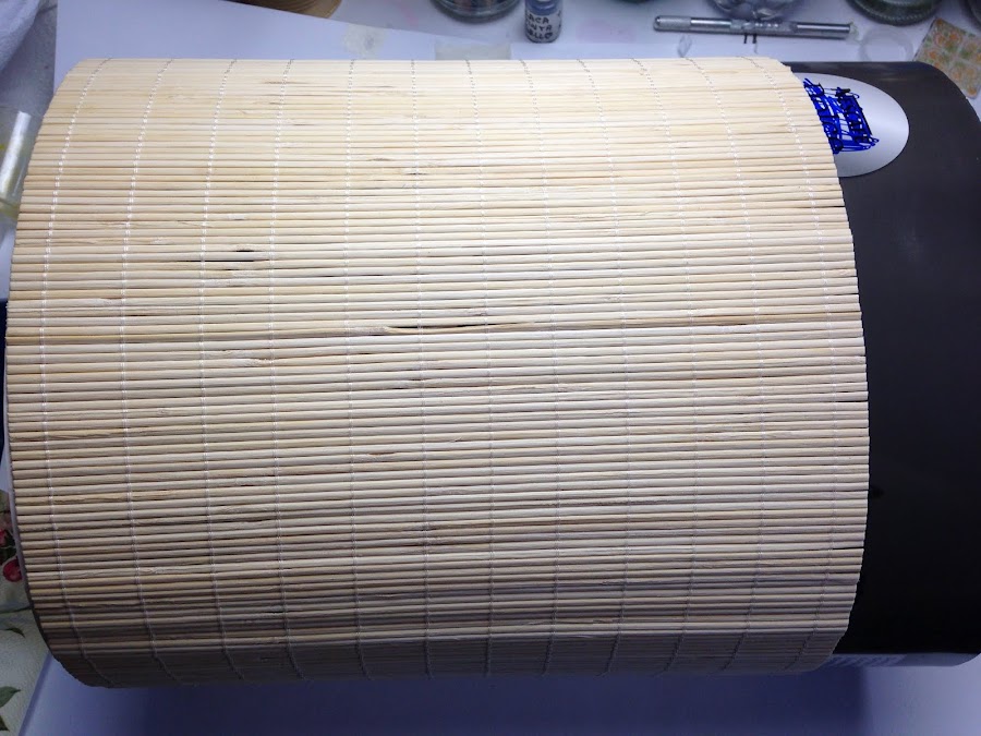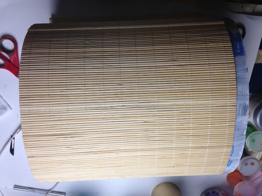 La idea de utilizar las esterillas de bambú es para darle rigidez y a la vez una superficie rugosa con diseño vertical en donde el decoupage toma la forma de esa superficie.