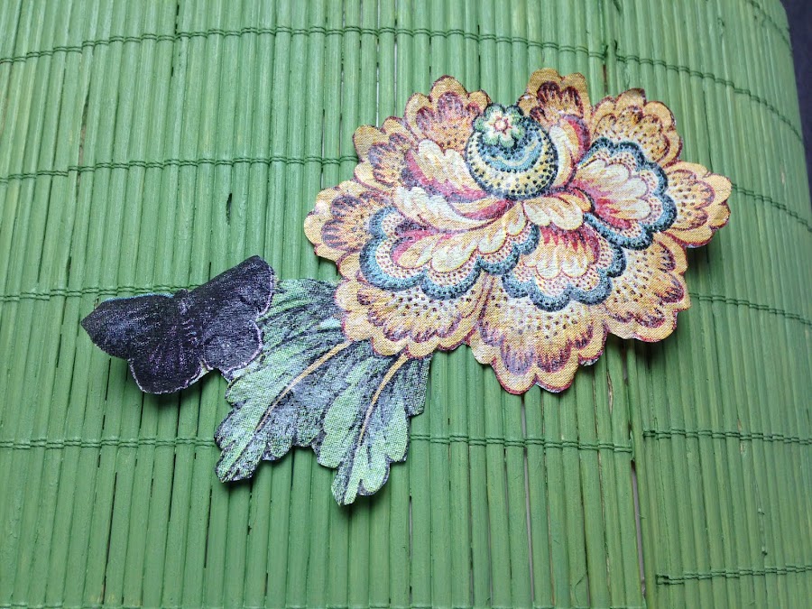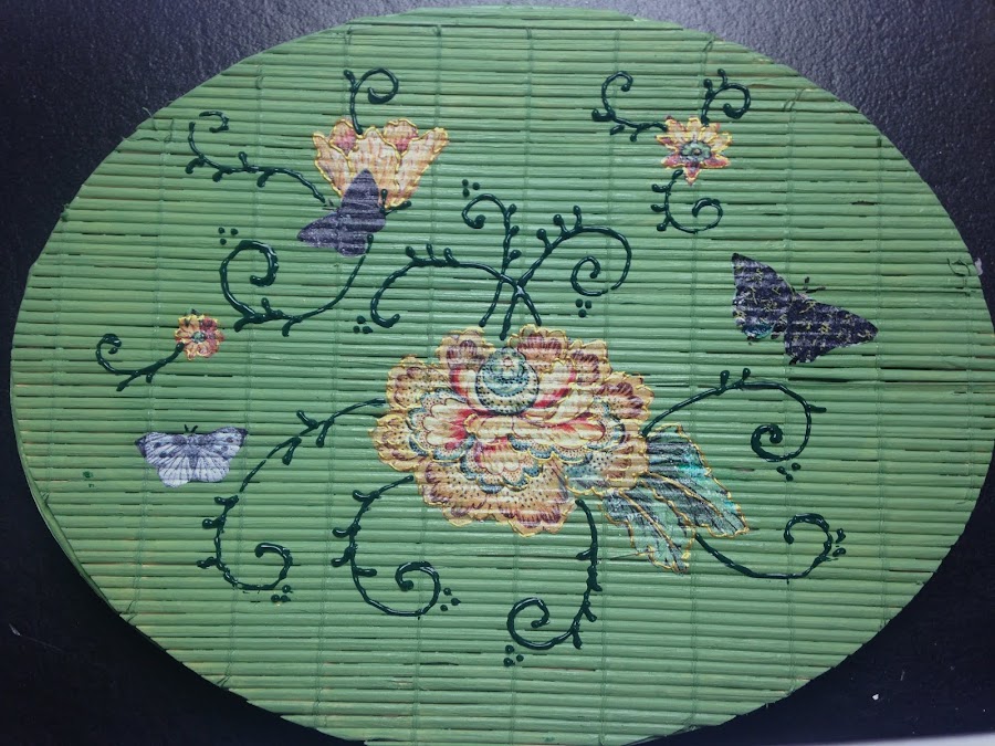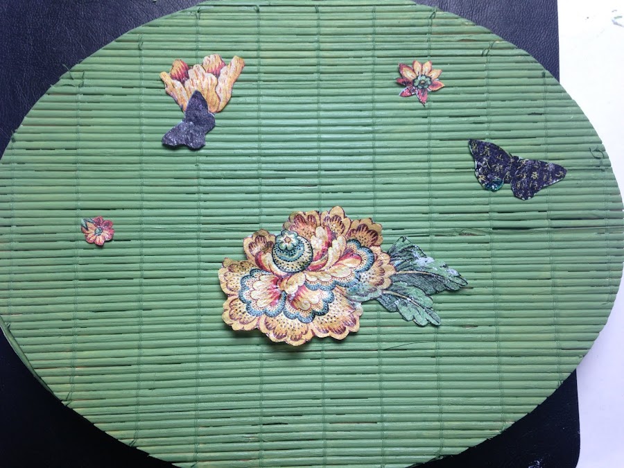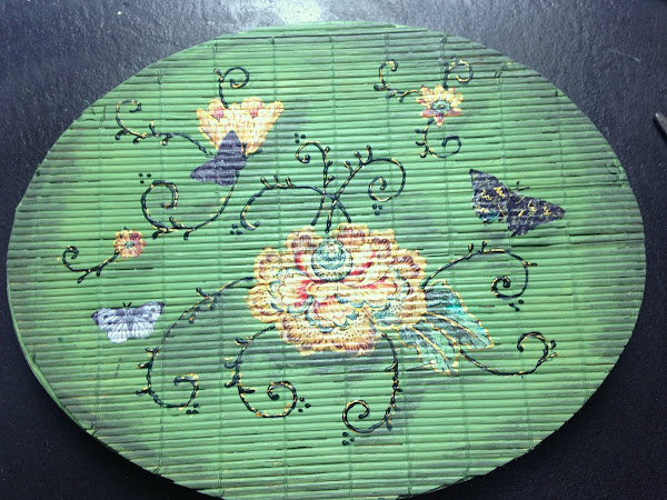 Para pegarla utilicé Barniz Acrílico, lo aplique primero sobre la esterilla y luego en la parte de atrás de la figura. Con un pincel lo fui aplastando hasta que tomó el relieve de la esterilla. Así seguí con todas las imágenes.