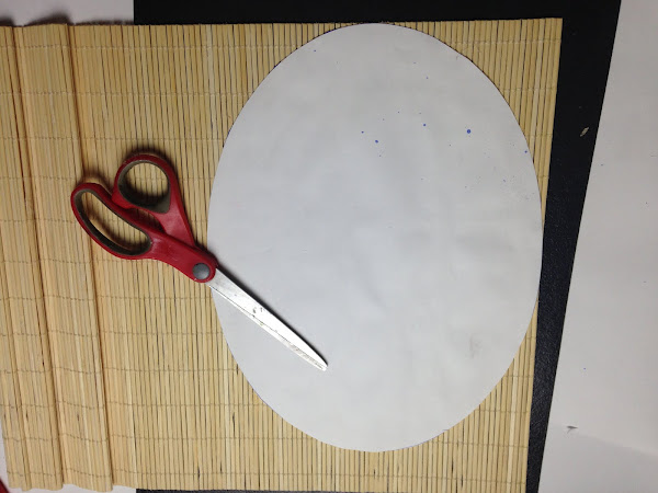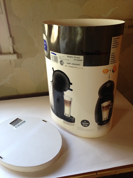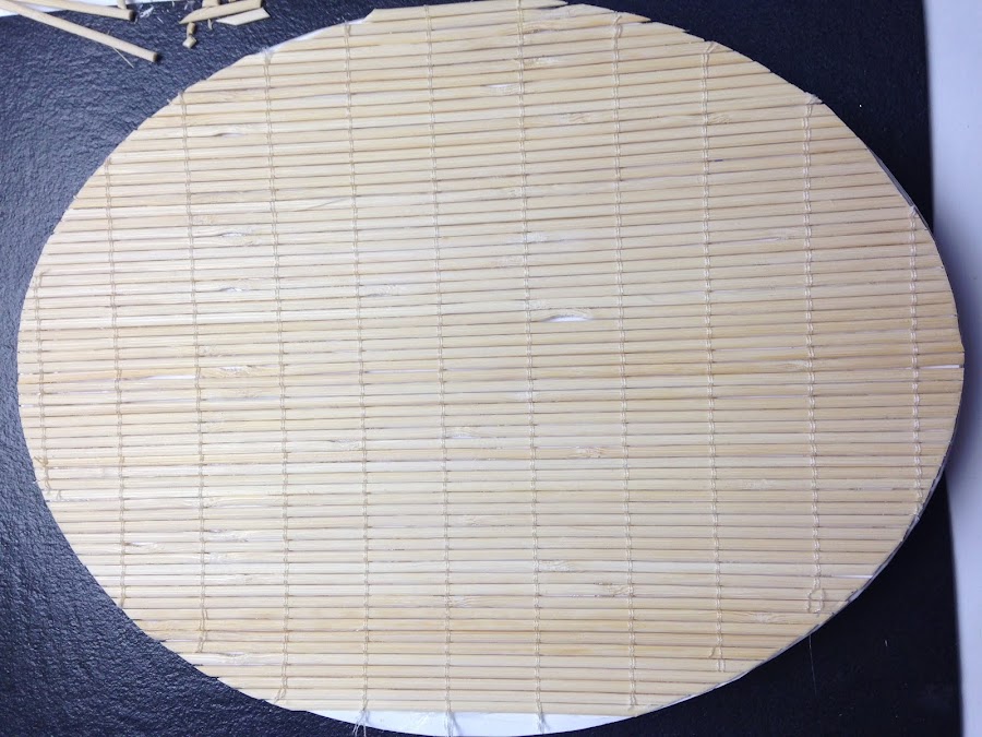Para pegar la esterilla en la parte superior de la tapa, como había que recortarla y con esa forma sería difícil ya que la esterilla es bastante dura, primero hice el contorno de la tapa sobre una cartulina y sobre esta pegue la esterilla, la recorte y luego volvia pegar sobre la tapa.