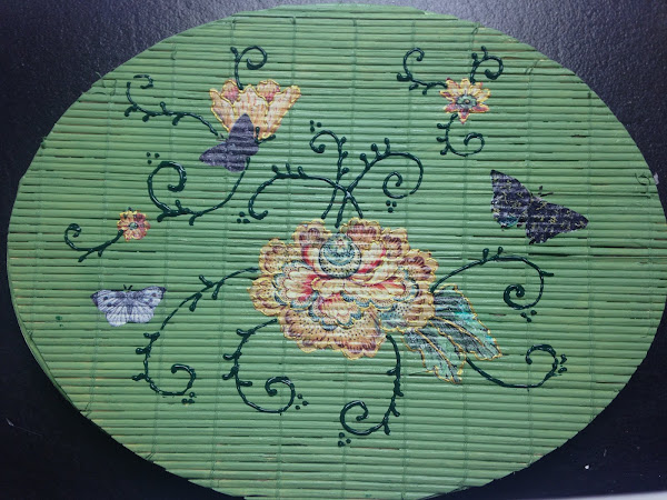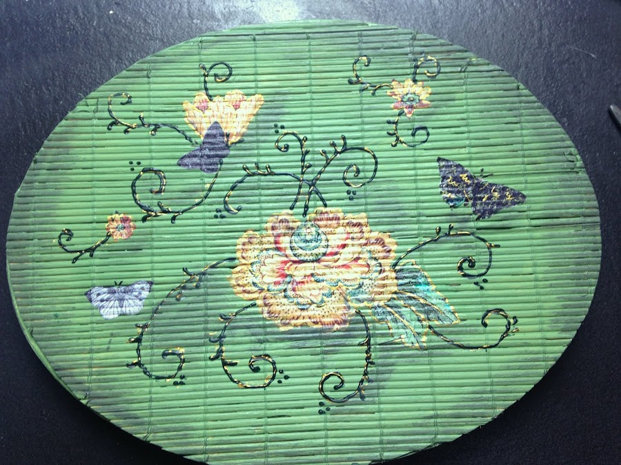 Posteriormente y con Pintura Acrílica como Dimensional (ver tutorial) le hice de manera muy suelta ramas y hojas. Y con dorado hice los bordes de las flores y las hojas. Si se quiere antes se pueden resaltar los colores de la servilleta con marcadores al agua.