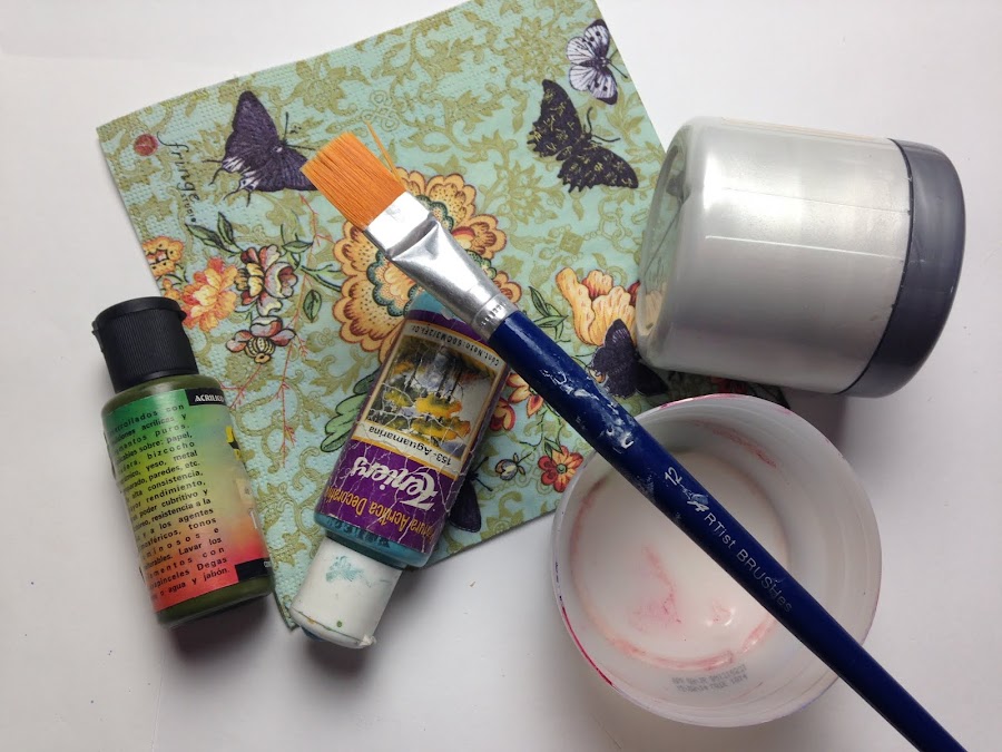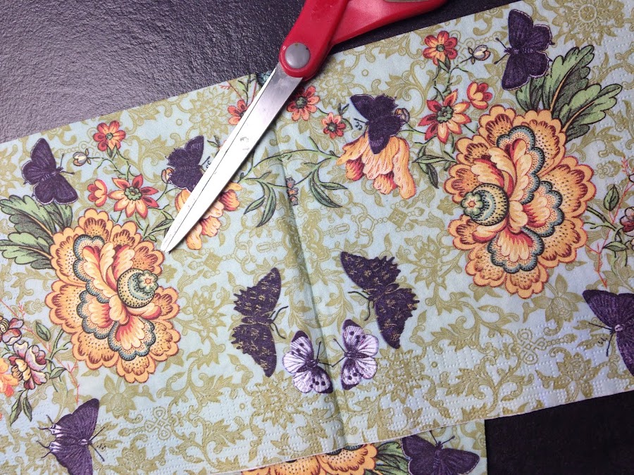 Para recortar la servilleta, separe las capas y a la principal le di una mano de pintura acrílica mezclada en iguales proporciones con cola vinílica. Al secarse se recorta muy bien.