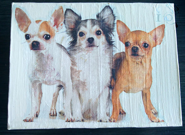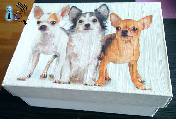 Partí de una caja de zapatos pequeñita, de zapatos de mi sobrina, que las mías no son tan pequeñas ni a que huele.... y le dí un par de manos de pintura a la tiza blanca. Usé esta pintura porque ya sabéis que no necesita imprimación y a mi me gusta que se noten las líneas del pincel... que le quede esa textura en la superficie, pero si no os gusta con darle una lijadita con una lija de grano fino después de seco todo listo. Luego recorté estos simpáticos perritos de una servilleta que tenía y realicé el decoupage igual que siempre: capa fina de pegamento de decoupage en la superficie, colocar con cuidado la capa de la servilleta dónde está el dibujo (sólo esa, retirando las otras dos) y colocando un film encima estiramos con cuidado, desde el centro hacia afuera, para que no que arrugas. Luego se retira el film y con cuidado se pone otra capa de cola para decoupage.
