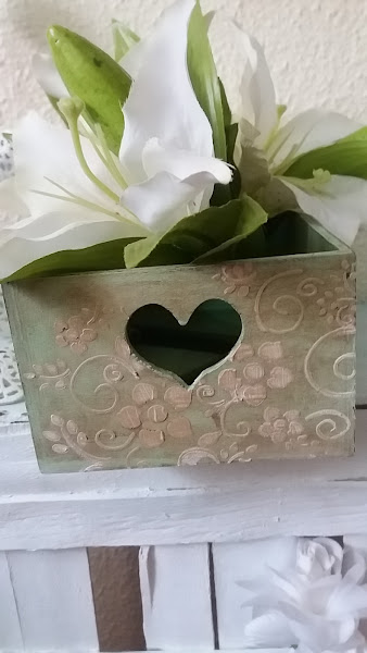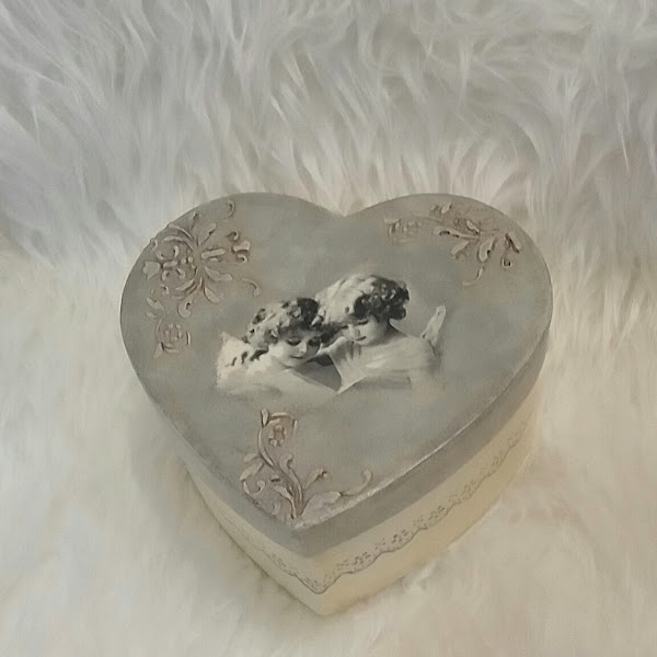Y esta " joyita "de caja, con forma de corazón, y unos angelitos totalmente integrados con pintura gris , y un bello stencil alrededor!!!