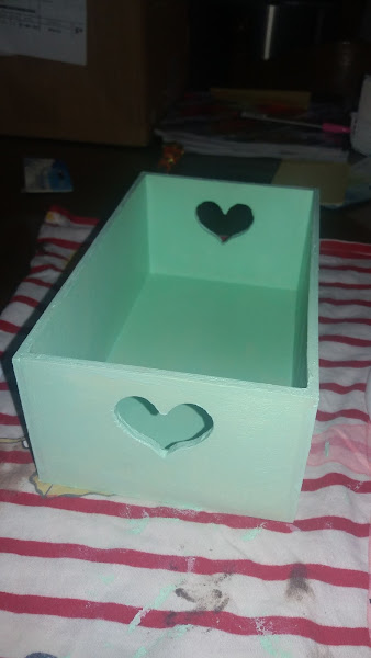 La pinté de verde mint, uno de mis colores favoritos. Y después le puse un estarcido en verde botella, y otro en blanco con relieve, envejecí con cera vintage toda la caja, y en el centro la decoré , con una moldura que , entre otras cosas me regaló, mi amiga Lola, del blog El Refugio de Lirtea.