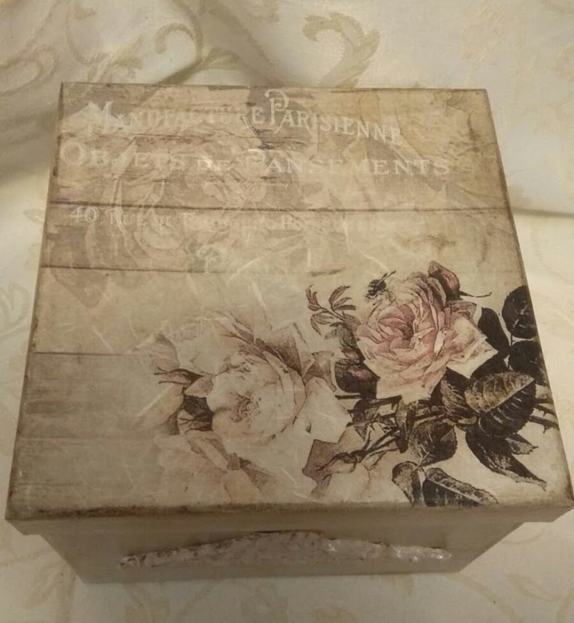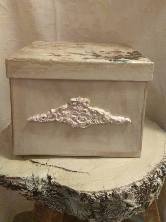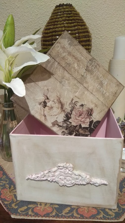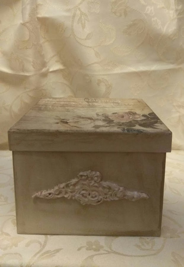 Hoy vengo con un encargo para una amiga, se trata de una caja de cartón cuadrada que he decorado; mezclando color siena y blanco y dando como resultado un tono beige muy luminoso, al que le apliqué unos toques a pincel seco, en tono marrón clarito y así conseguir el efecto envejecido deseado.