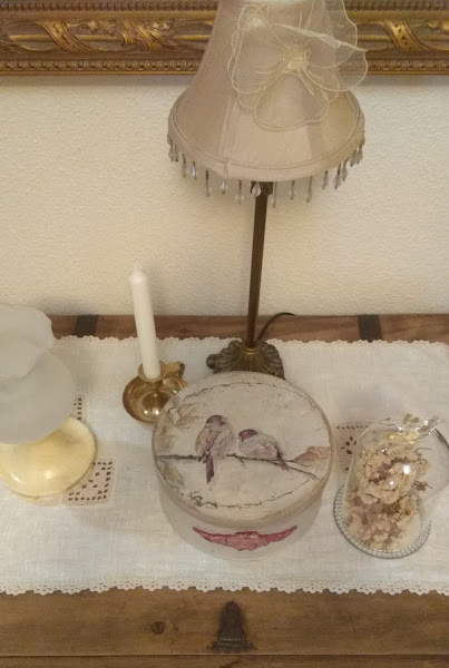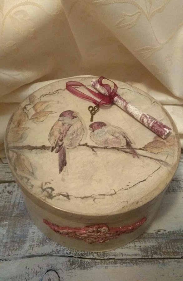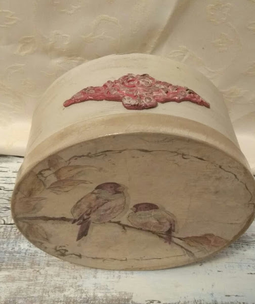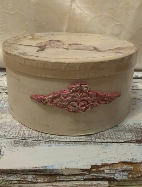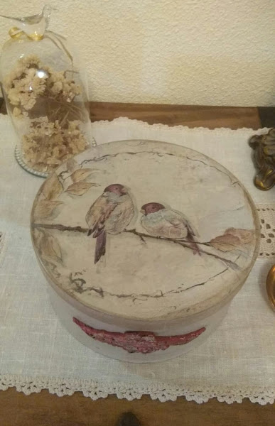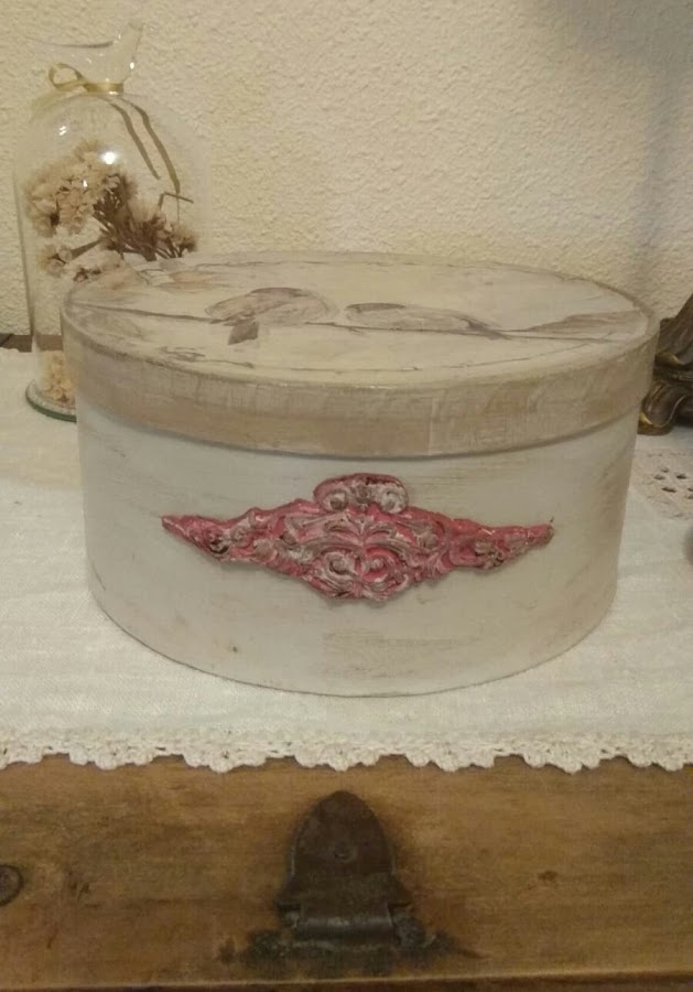 Marta nos ha convocado a esta quedada de su cumple y por supuesto yo quería acompañarla.La caja es de cartón, la he decorado con un papel de decoupage. Está pintada con una mezcla que hice de unos restos de pinturas que tenía, en los tonos gris y rosa bebé. El resultado es un tono beige tostado. Envejecida con cera vintage y decorada con una moldura pintada en fresa boho, y a pincel seco le dí con la misma tonalidad de la caja , para envejecer unos toques de betún de Judea y "le voilá".