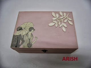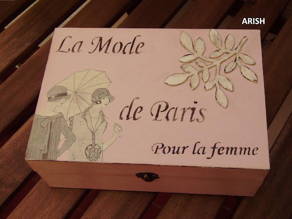 primero he lijado con mucha suavidad y con cuidado de no estropear la aplicación de papel después he añadido la escritura con plantilla, he oscurecido todos los cantos de la caja y de la ramita de madera en relieve y también por toda la caja en general con toques suaves en color marrón chocolate y por último una capa de cera y ahora sí que puedo decir que ya estoy conforme, me gusta más así