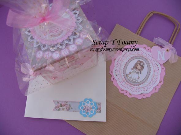 Y por último una bolsita y una tarjeta, que ya os enseñaré, decoradas también con papeles de Dayka, y un papel transparente para dejar ver la cajita y ya tenemos listo el regalo.