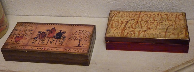 Y, para que veáis que no exagero con eso de que me encantan las cajas, aquí va una muestra de algunas más que he hecho, con découpage, con técnica de patchwork sin aguja. en papel...
