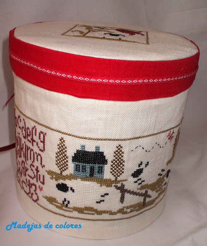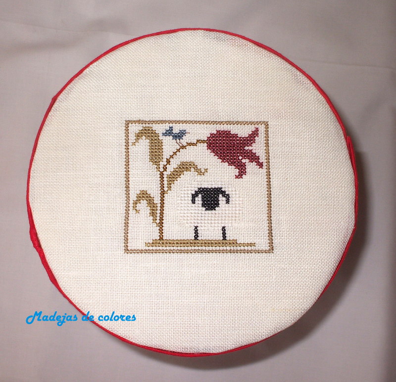 Está todo bordado en lino crudo. Para la tapa, una oveja del 1, con la cual forré guata y cartón y pegada a esta. En el lateral, lino rojo con cartón y una cinta como adorno.