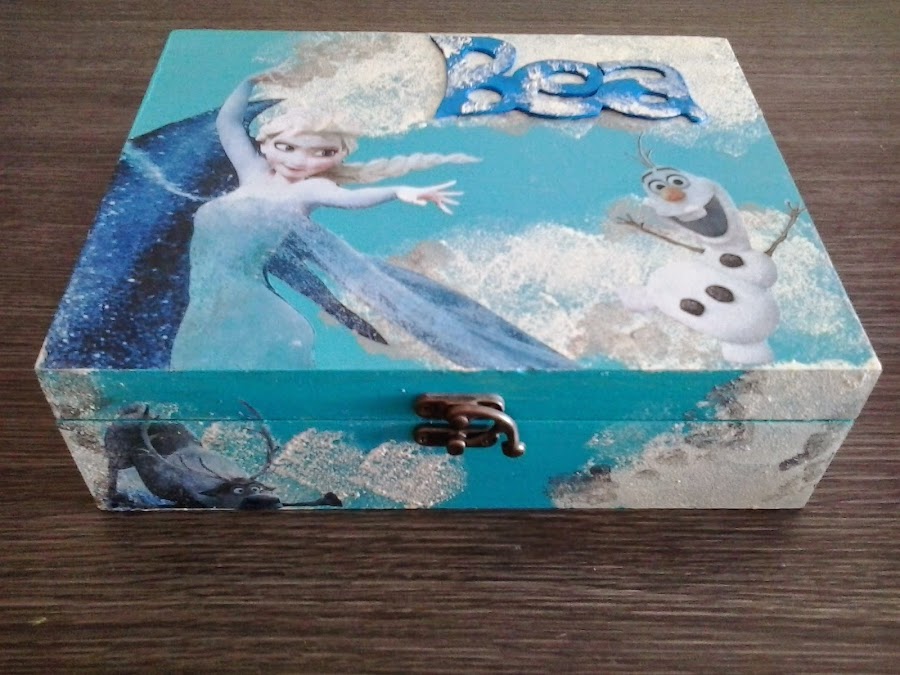 Hola a tod@s!! aquí os presento otro encargo de una caja Frozen. Esta vez es para una niña de seis años, espero que le guste. La caja está pintada con acrílicas y los copos están hechos con stencil. En la tapa está el nombre de la niña, con un poco de purpurina. Las imágenes están hechas con transfers