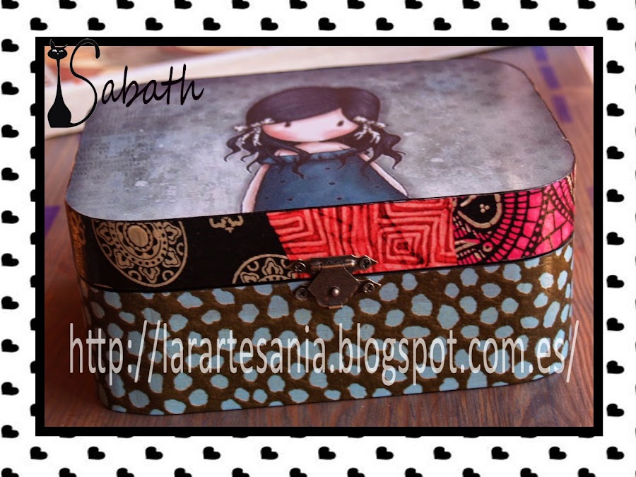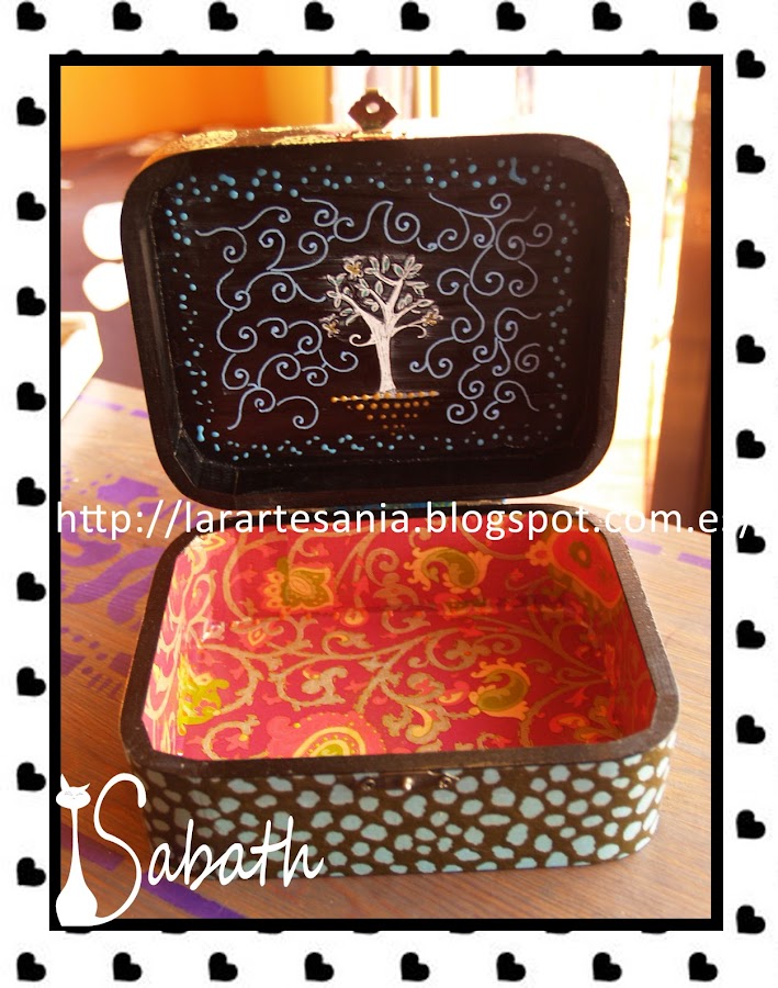 Os explico un poco, la lamina la he imprimido en papel fotográfico que compre hace un tiempo en lidl a un precio bastante razonable, el tamaño para adecuarlo a la caja lo cambie con photosop, l@s que no tengais photosop podeis usar el photoscape (si no me eequivoco) que tiene bastantes utilidades y lo encontrais en la web de forma gratuita, el resto de papel es de la casa decopatch, me encantan los colorines que tienen y para la cara interna de la tapa he usado un sello, pintura de relieve y un rotulador posca para pintar las espirales, en breve hare otra que quiero regalar y con menos prisas realizare tutorial.