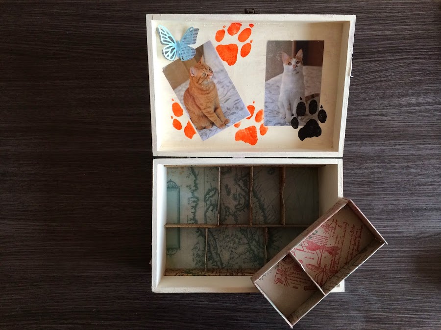 Y por último la parte interior. En la tapa, están los dos gatos del dueño. He usado unas plantillas para hacer las zarpas de los gatos, y la mariposa está hecha también con un troquel.