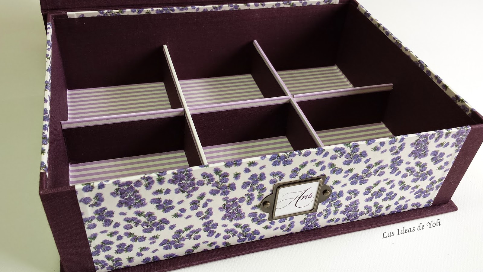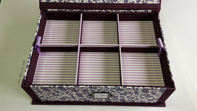 Está realizada el tela lila y papel de flores Tassoti. Interior en doble altura con bandeja.