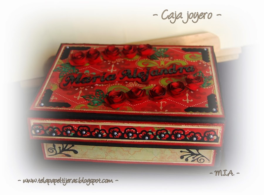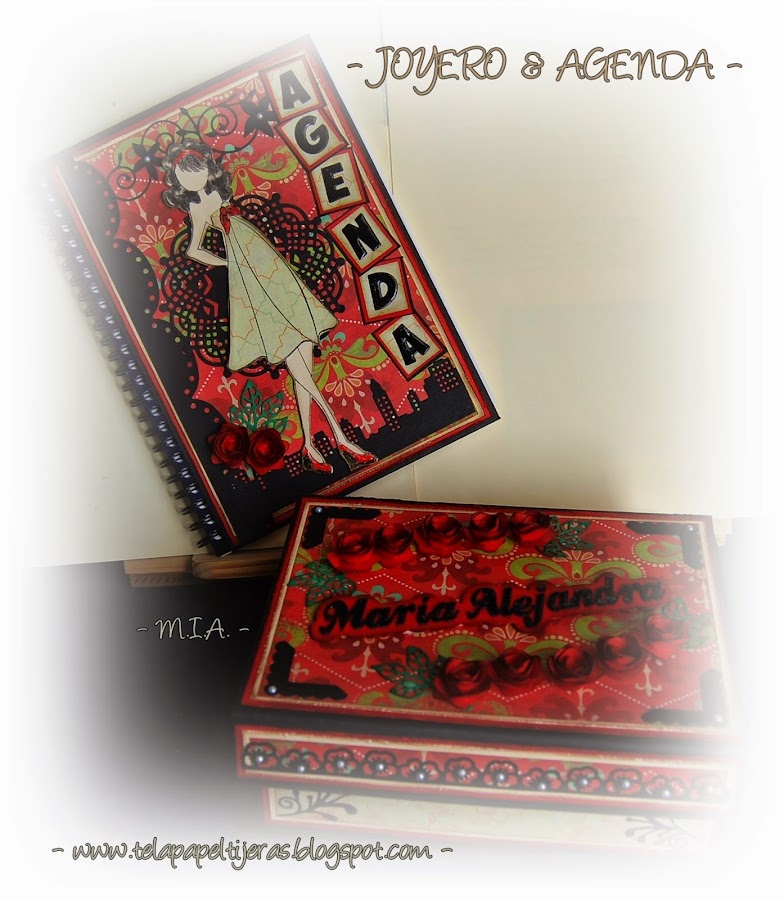 Papeles de M & M en un potente color rojo que combiné con cartulina negra y crema. Adornos de troquelados, flores caseras y letras recortadas con la Craft Robo varias veces y pegadas entre sí para simular chipboard y con una buena capa de Glossy Accent para dar brillo y volumen. El joyero se cierra con unos mini imanes y la muñeca de Prima de la agenda va "vestida" con la técnica de paper piercing...