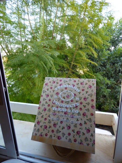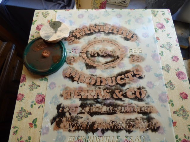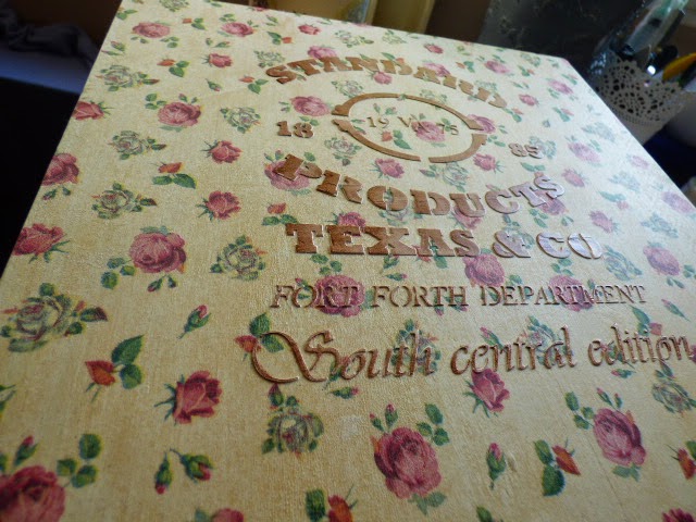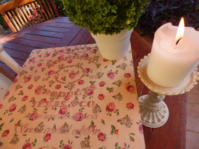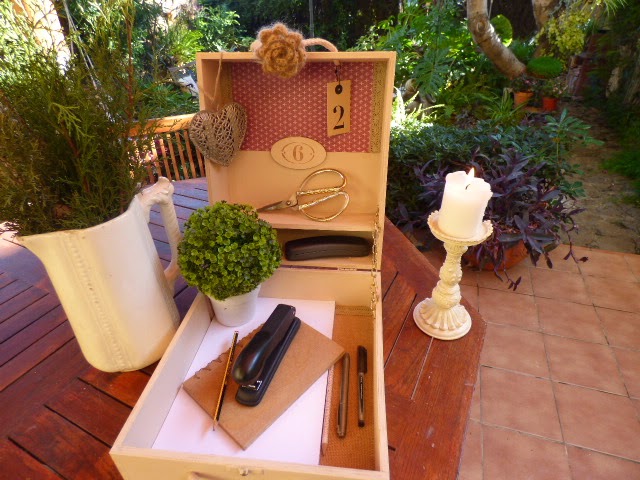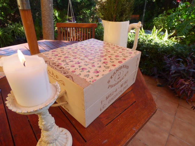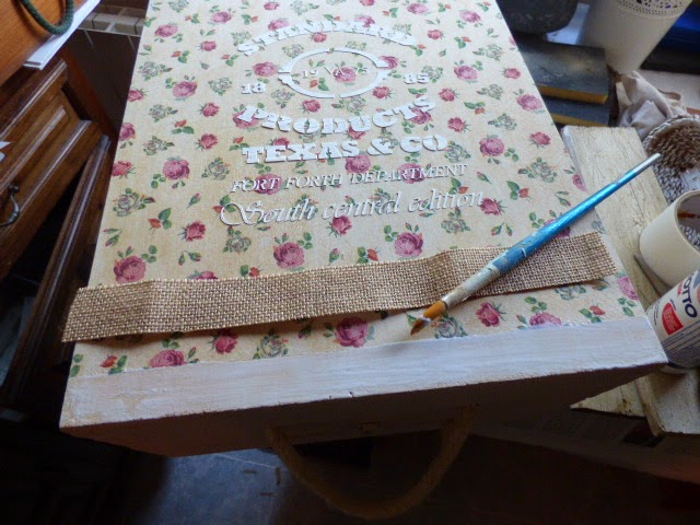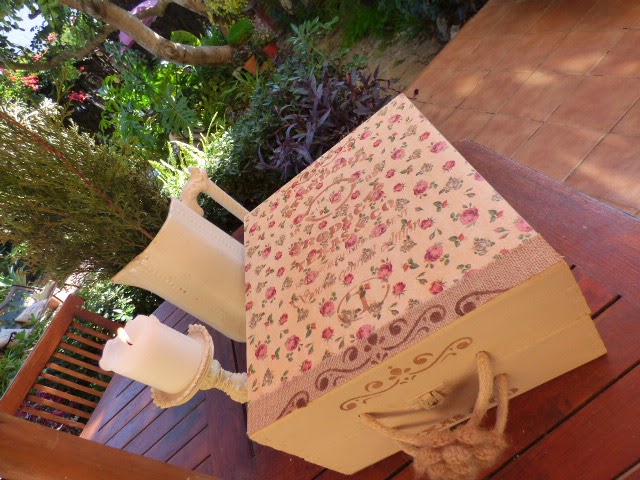 Esta caja me la dieron hace un tiempo.....es una caja de vino algo diferente......su dueña la utilizó para poner los materiales de pintura y dibujo. Tiene una forma distinta a las habituales, en realidad es como una maletitaNo tengo fotos del principio.....pintar la caja, hacer el decoupage con esta servi y barnizar la servi para impermeabilizarla, porque lo siguiente que iba a hacer es un estarcido en relieve.