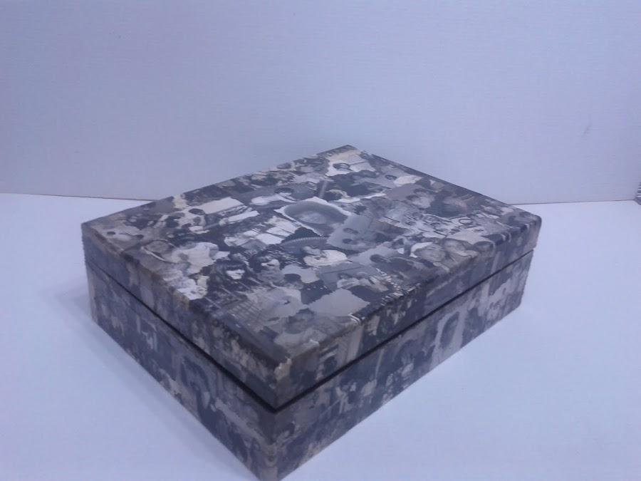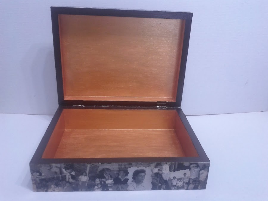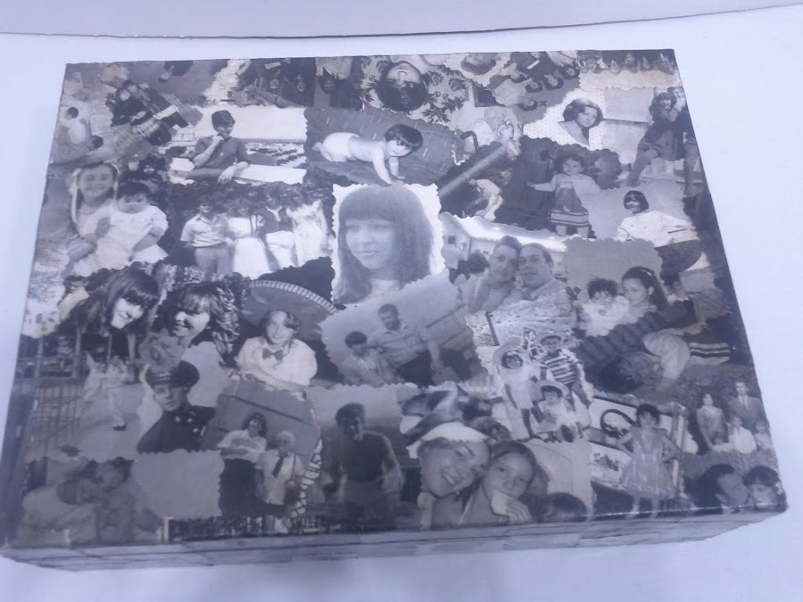 Caja de madera forrada con fotografias y pintada con acrilicos