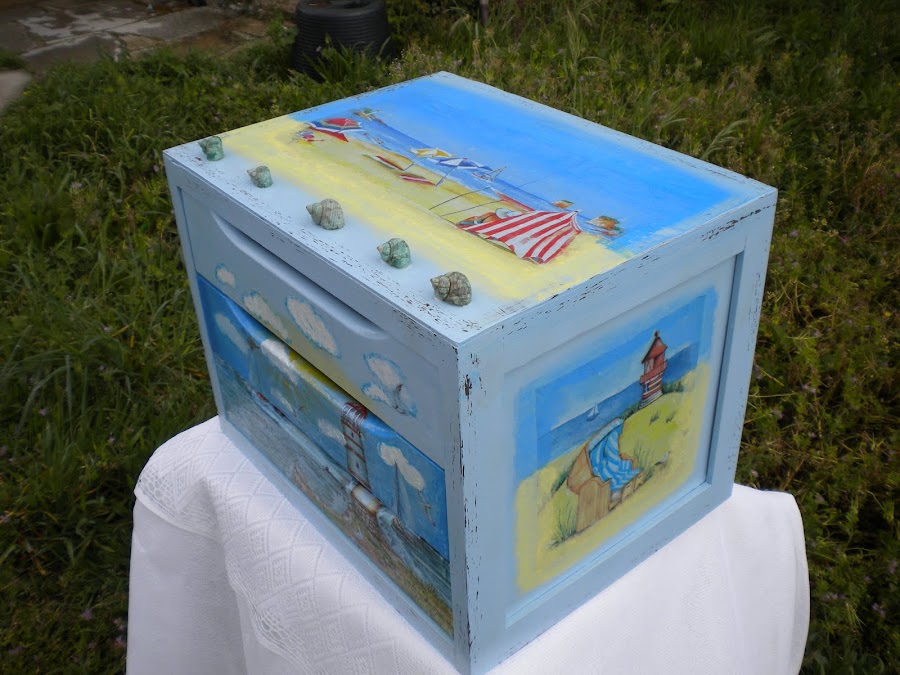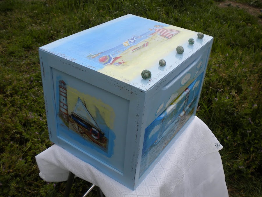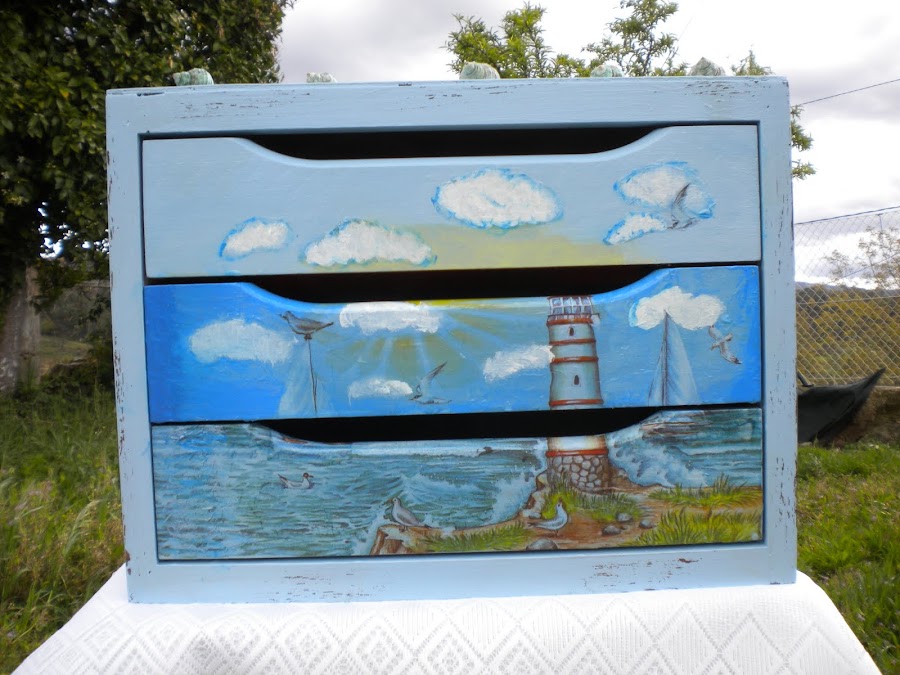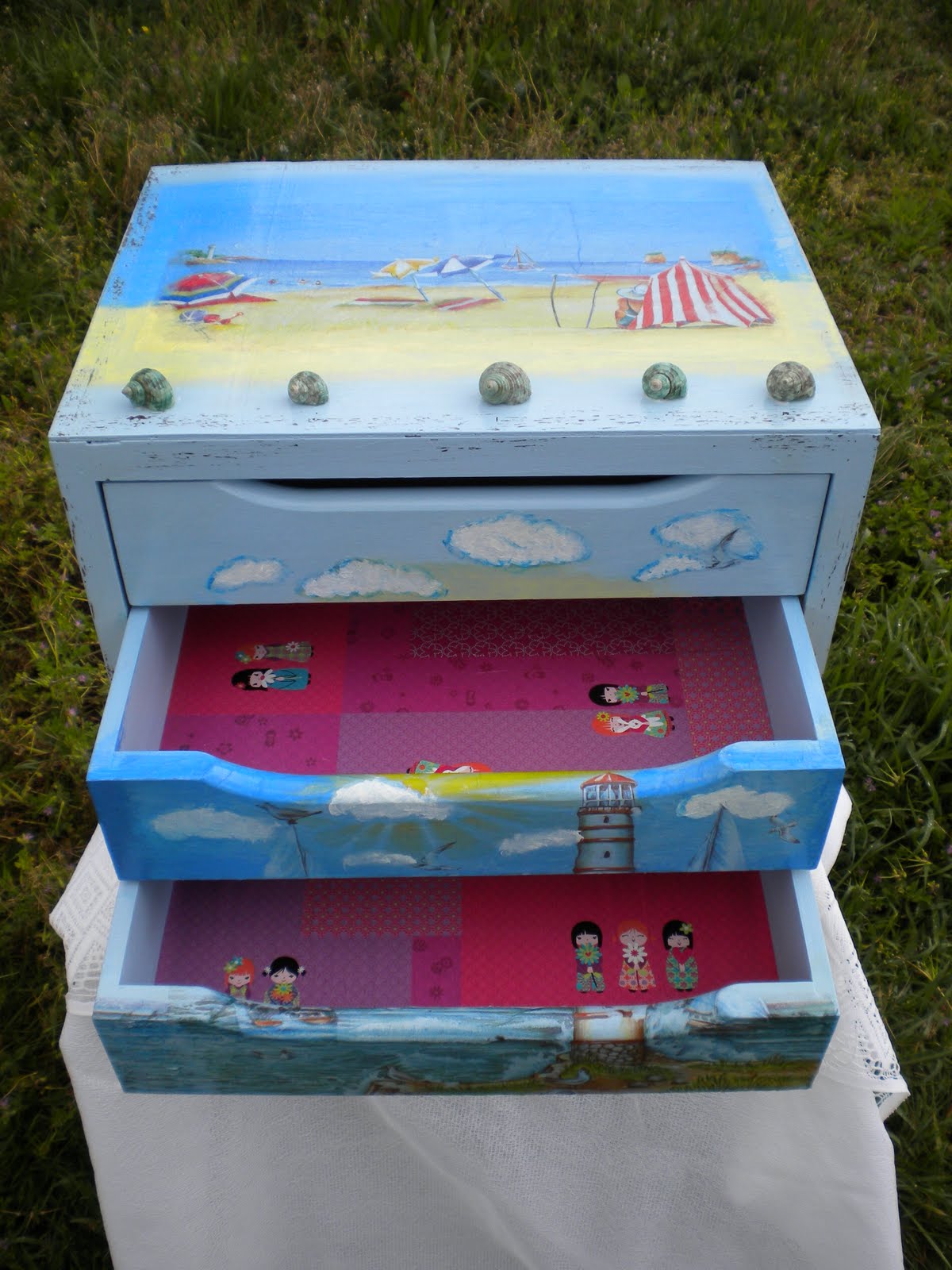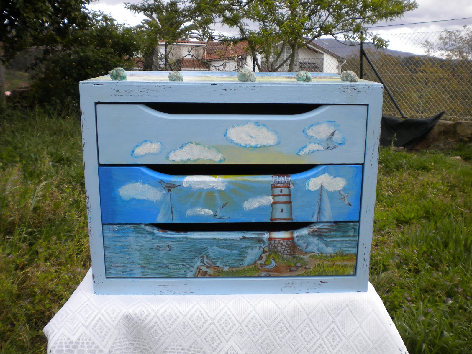 Mi sobrina hace tiempo que tenía ganas de una caja con motivos marineros porque ya había visto otras del mismo estilo que había hecho anteriormente, así que su madre me encargó que le hiciera una en secreto para regalarsela. Secreto que nos ayudó a guardar su hijo y nieto, respectivamente.