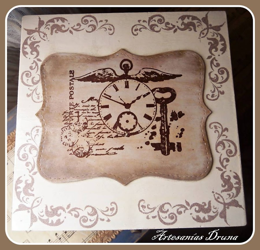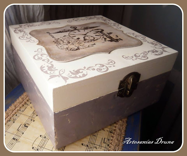 Esta cajita de madera me la consiguió mi querida Mar, y se fue para mi querida Mamen. Está realizada con acrílicas, entelada con doble faz y stencil.También va decorada con tela de arpillería barnizad ...