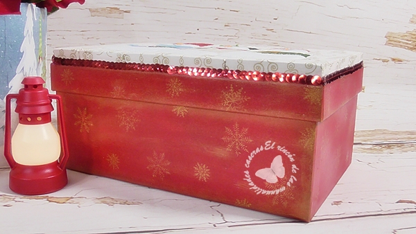 Pegando el pequeño cuadro que realicé en la parte superior de la caja y rematándola con una tira de lentejuelas.