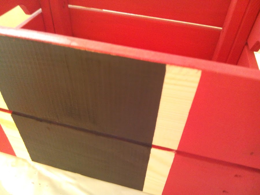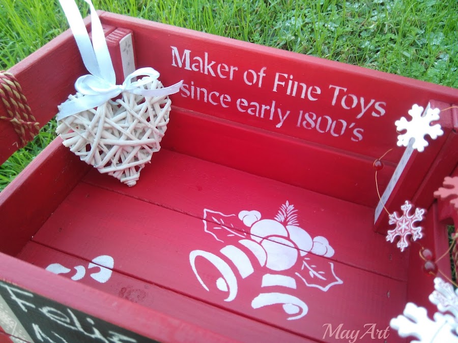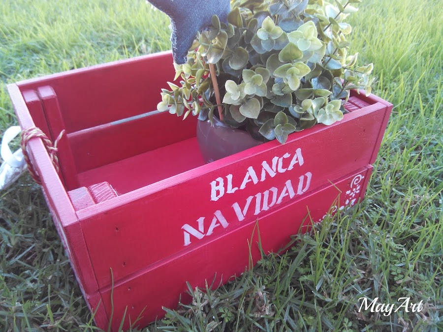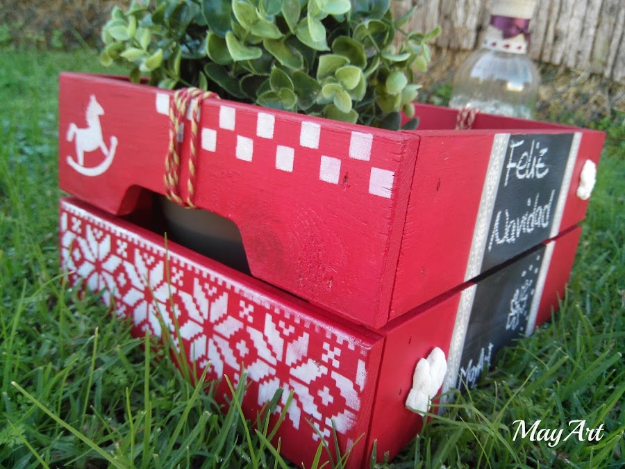 La pinté con una mano de pintura de tiza en tono rojo y le hice unos estarcidos blancos con la combinación de varias plantillas de acetato.