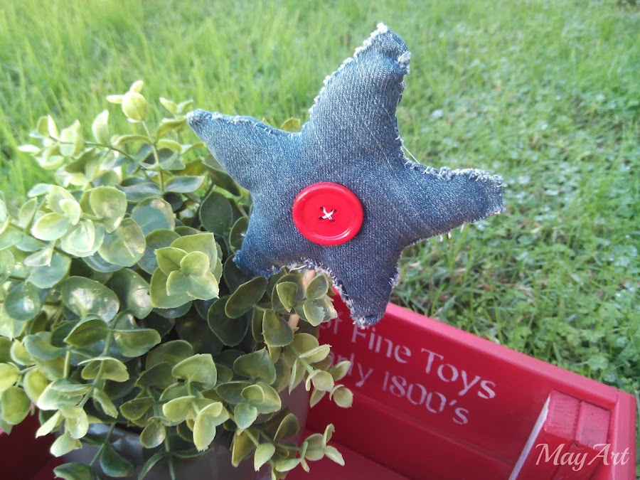 ¿Y qué me decís del muñeco-reno??? Es genial!!! Y la estrella vaquera...ayyy la estrella vaquera, esa sí que es cosecha propia, pero de esas hechas así, a lo loco y conforme quede, con los por aquí y por allá, por fuera, a puntadas desiguales y como caigan...¿A que mola??? Con un bajo de un vaquero que guardé, mirar qué estrellita, jejeje Aquí no tiramos naaaa