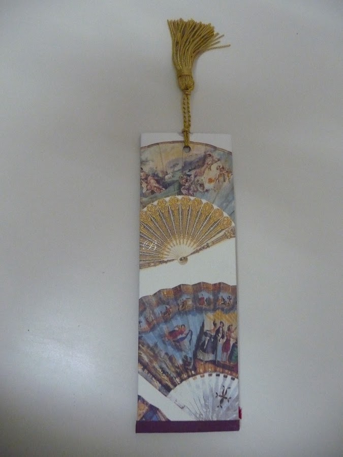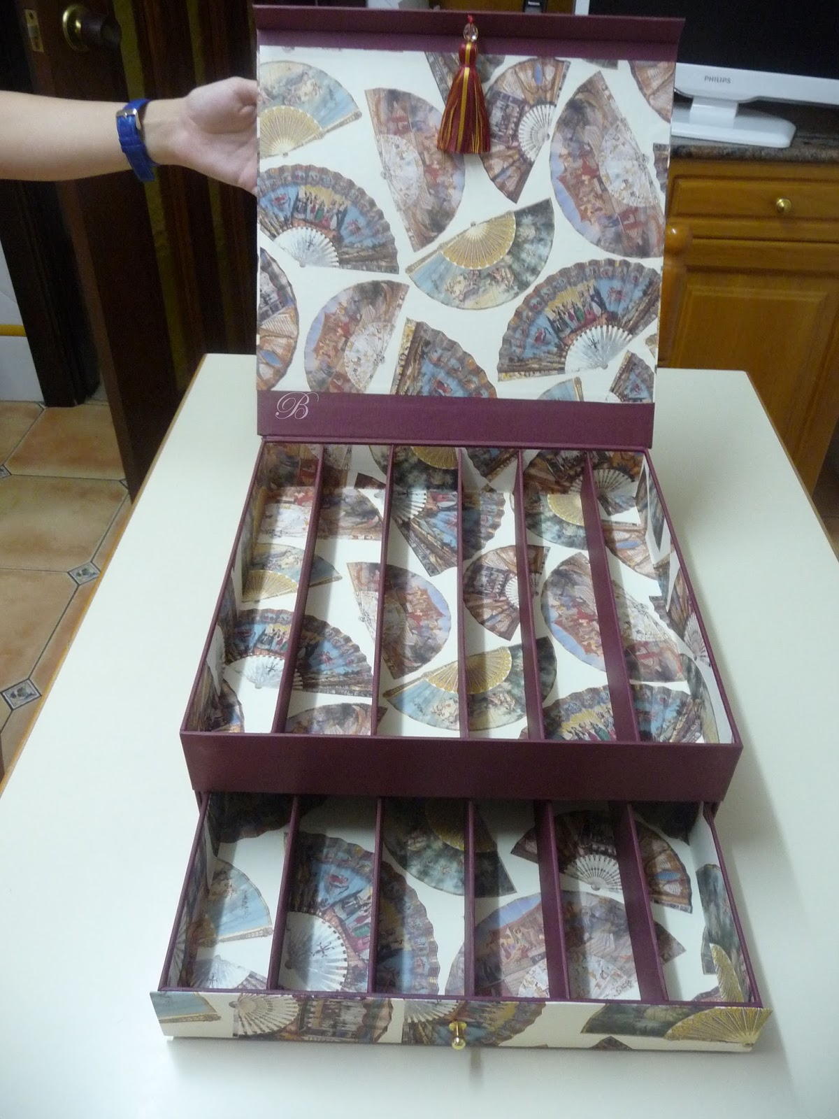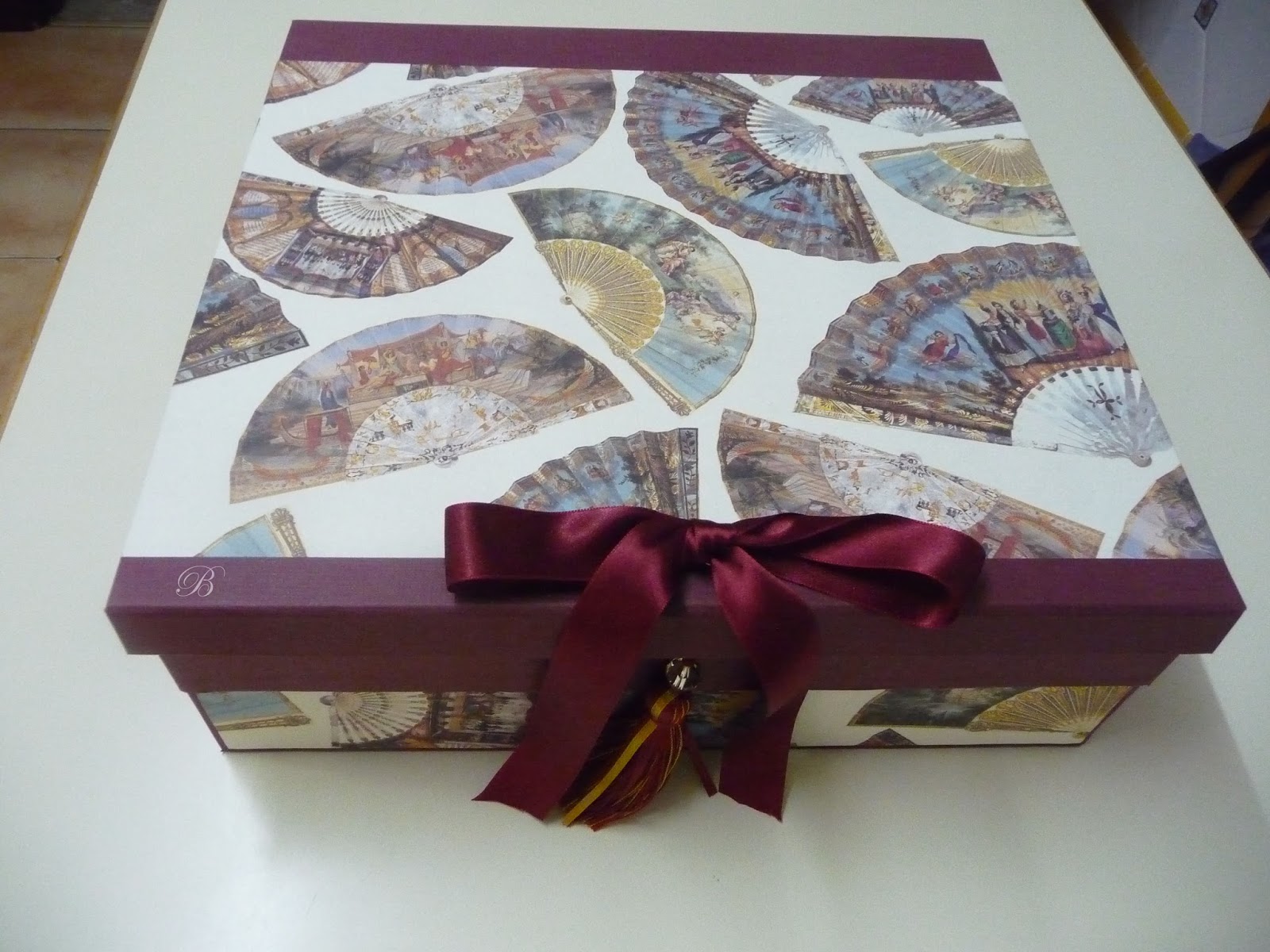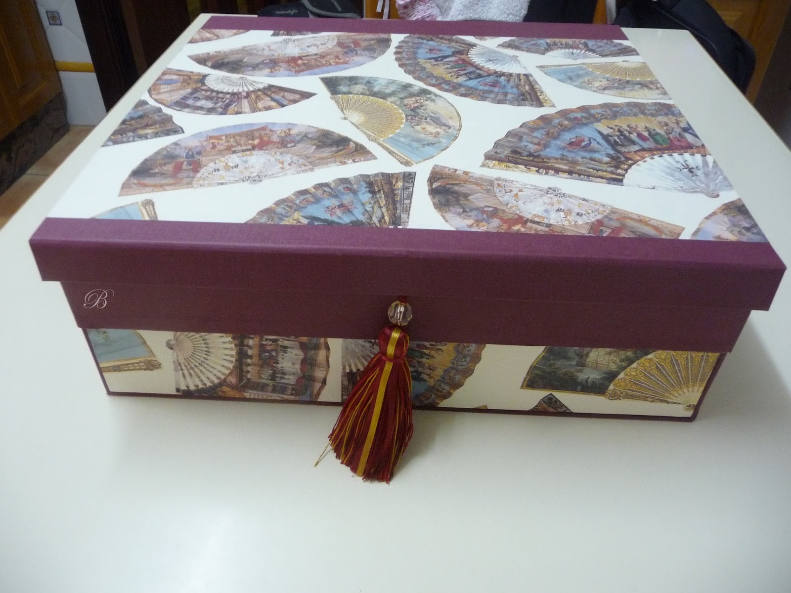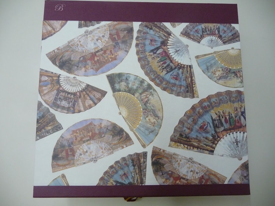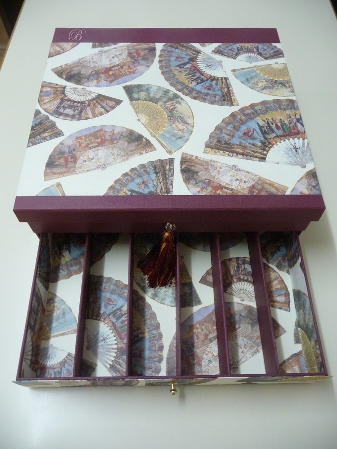 Yolanda me encargó una caja para 12 abanicos, el cierre es con imán y lleva una borla preciosa para levantar la tapa. Esta realizada en dos plantas y con unos trocitos que me quedaron le hice este separador de regalo. Espero que os guste