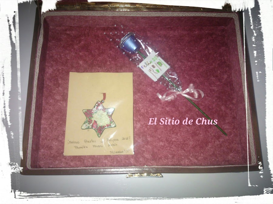Y unos detallitos navideños dentro. La preciosa rosa la hizo mi marido, que le está cogiendo gusto a lo hecho a mano, jajajaja,