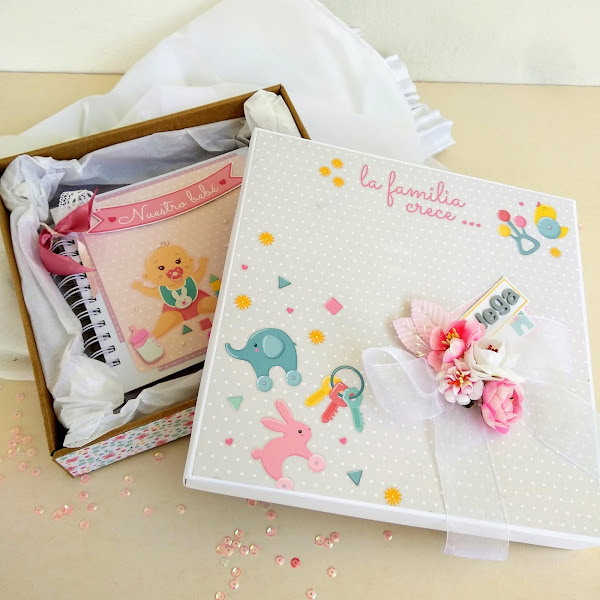 Éste era un proyecto que necesitaba hacer rápidamente y con la caja de SelfPackaging lo tuve muy fácil, la monté en un "tris tras" y forré la tapa y los laterales, además, como era un regalo le puse un lazo con flores y unas etiquetas con el nombre de la bebé, todo en un momento.