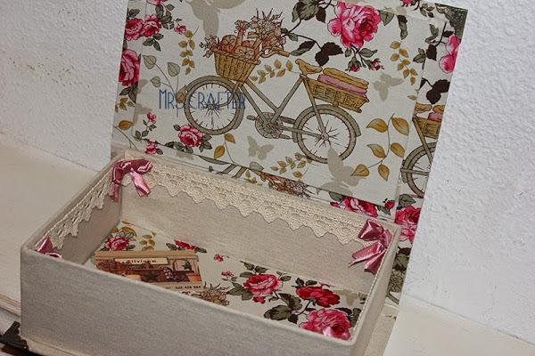 Un nuevo regalo de comunión que me pidió M: Una caja libro forrada con unas telas muy vintage: Bicicletas, flores, puntillas, lazos...
