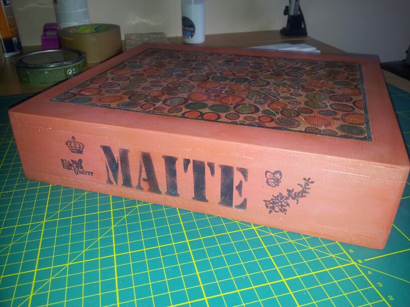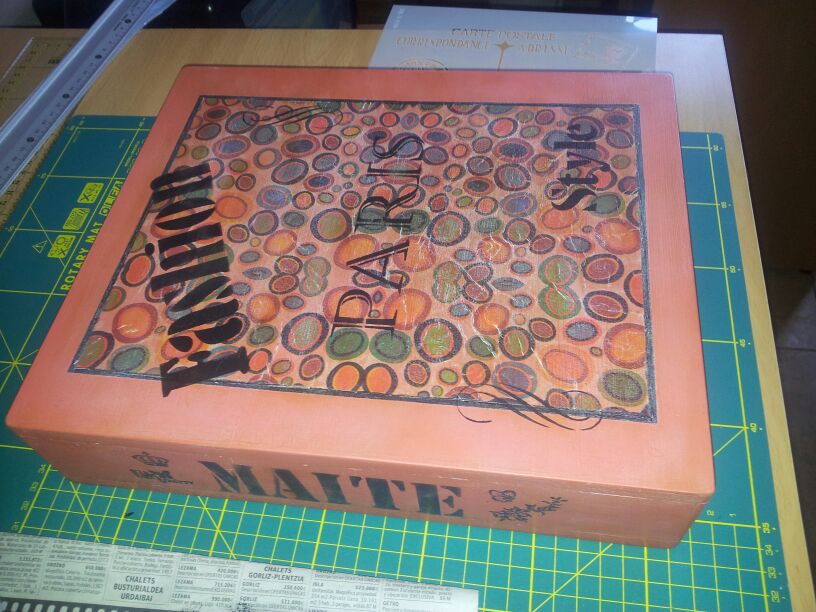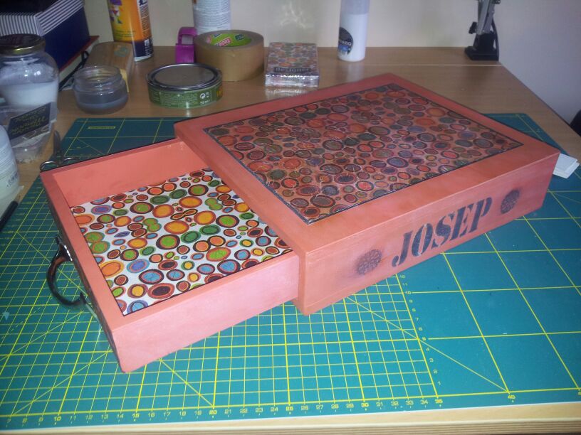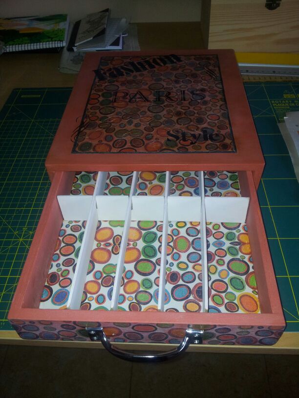 Esta caja es muy especial, es un trabajo conjunto entre mi marido y yo. El ha aprovechado unos restos de maderas y con la idea inicial y un poquito de maña me ha hecho la estructura (es un manitas jajaja).
