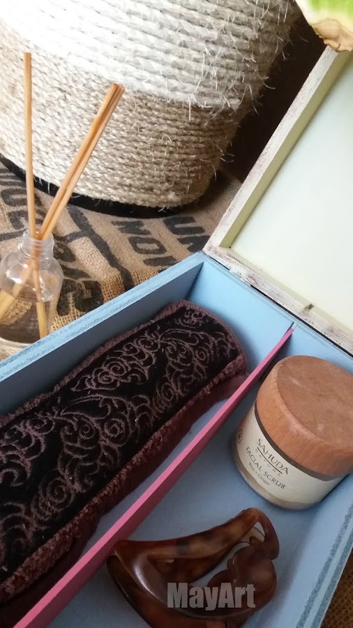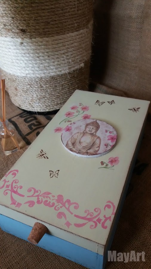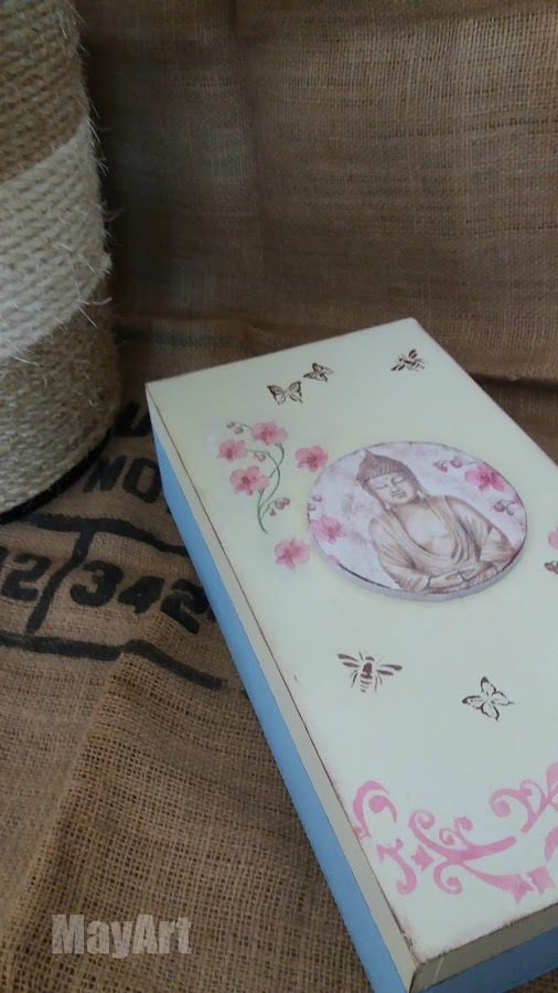 La primera vez que hago algo tan zen, pues no es muy de mi estilo, pero al ver la servilleta del buda con sus flores de almendro, no pude evitar el crear esta caja para el baño de una de mis clientas más fieles.