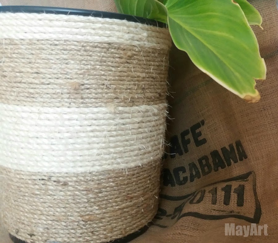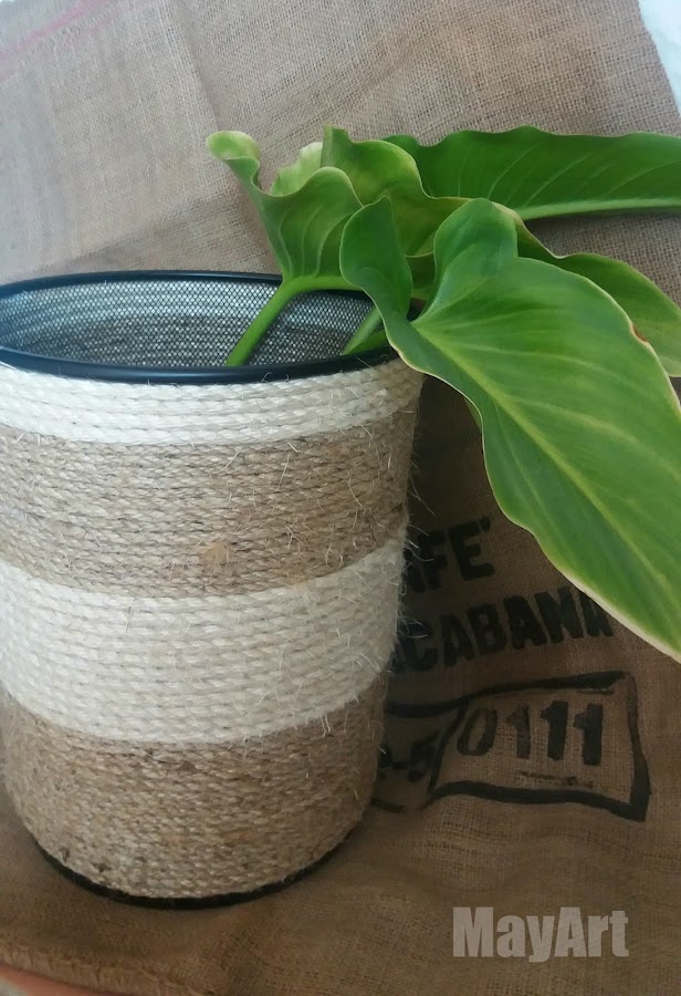 Es una de estas de aluminio negro que cansada de verla, encontré unos restos de cuerda y la fui forrando en dos tonalidades. Le confiere un aspecto más rústico y le va que ni pintado a la deco de ma petite maison!!