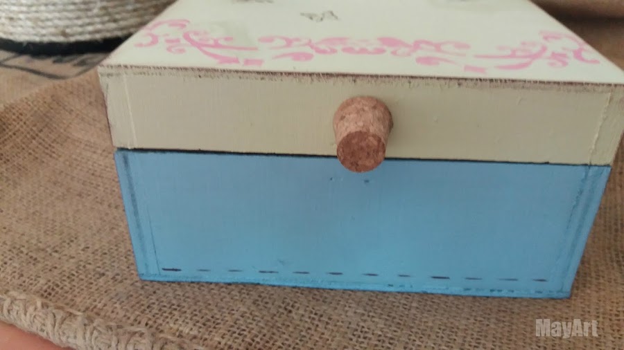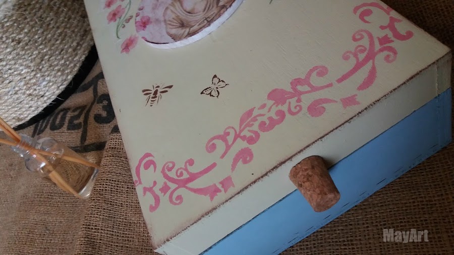 La madera de la tapa tenía grabada una inicial que tapé con esta plaquita tallada a mano de madera también, y en la que decidí dar protagonismo al buda. Unas flores alrededor y unos estarcidos de abejas y mariposas en color chocolate.