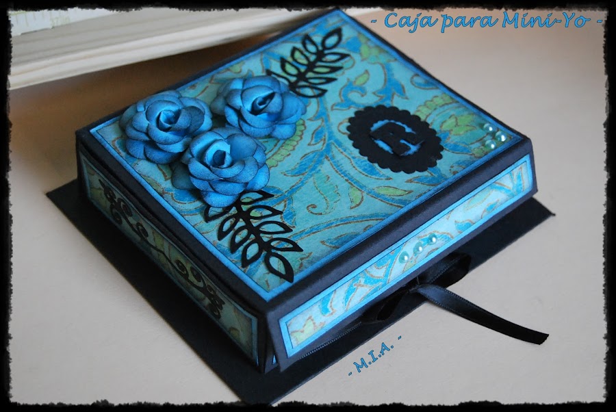 Teniendo las medidas del mío como punto de referencia empecé a cortar cartones, cartulinas y papeles del taco-papeles y amontar se ha dicho... Unas flores caseras, unas perlitas, unas hojitas troqueladas, la inicial pegada varias veces en unos pequeños scalops ovalados y aquí está el trabajo terminado...