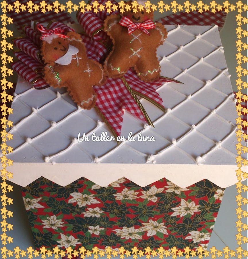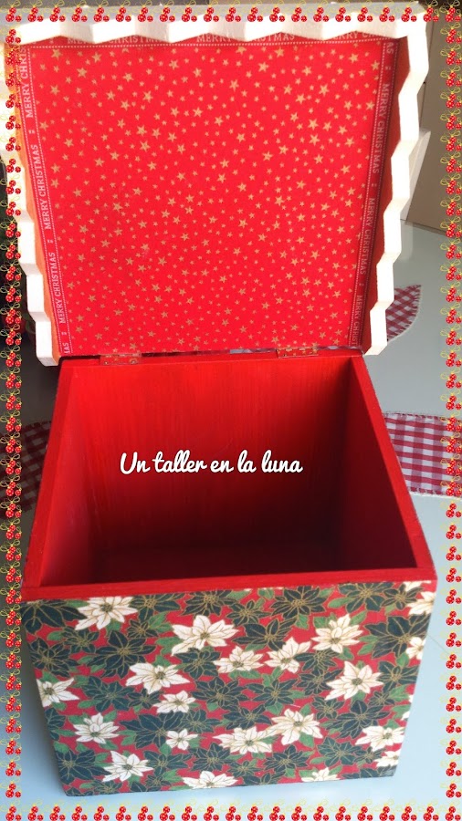 Es de madera y esta pintada como podeis ver y entelada con tonos muy navideños.La parte de la tapa la decore como si fuera una tarta, y el resultado es este que veis, la persona que la encargo quedo muy contenta con el resultado. Y a ti,te gusta?.Dejame un comentario para saber tu opinión . Besos