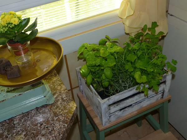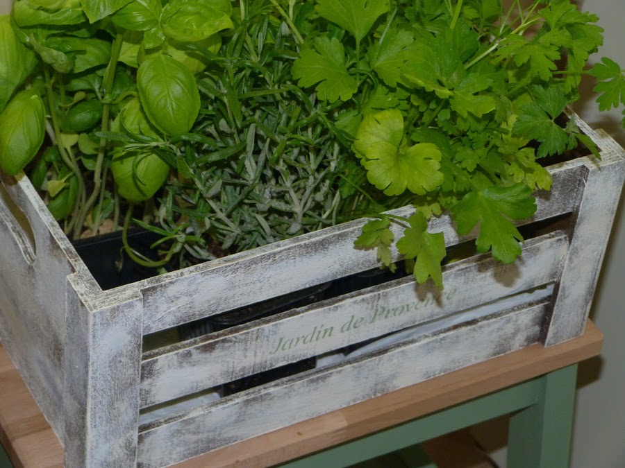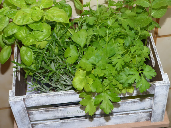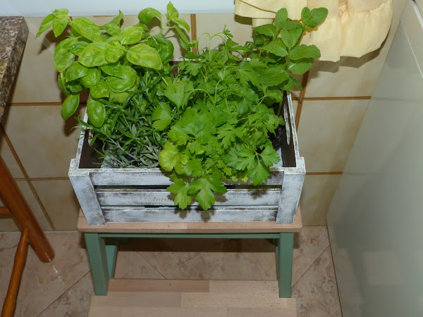 Y ayer, por fin, la caja ocupó su lugar, llena de plantas aromáticas: perejil, cilantro, hierbabuena, romero y albahaca. No veía el momento de comprarlas, hasta que ayer las encontré de oferta, tan sólo a 0,99 cada una!