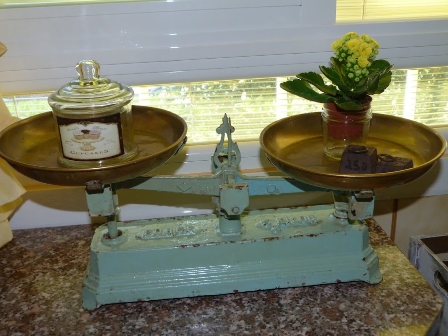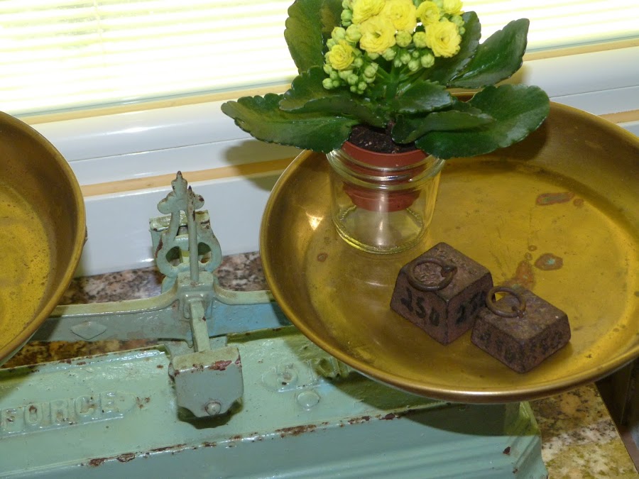 Las pesas me las regalaron con la balanza. Lo único que hice fue limpiarlo todo bien. Tenía montañas de porquería acumulada de muchos años. Me encanta tal y como está, con todos sus descochones y su óxido.