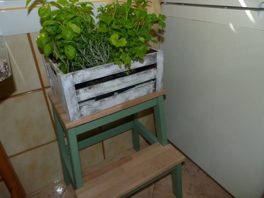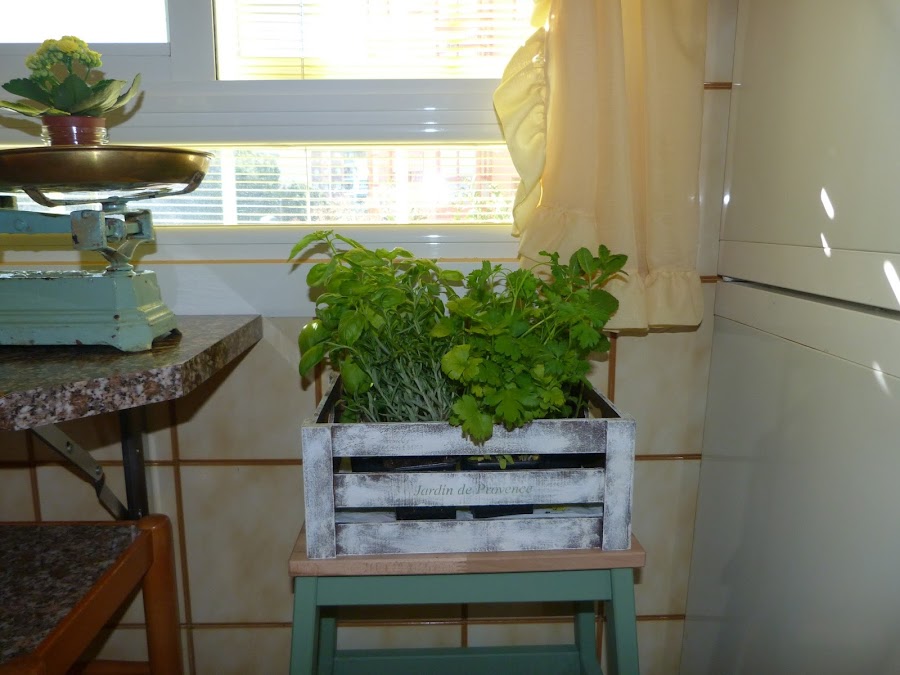 Creo que el lugar es el más adecuado, bajo la ventana, donde las plantas tienen más luz. Cuando necesite el taburete, tan sólo tengo que quitar la caja. Tiene unas asas muy cómodas para transportarla.