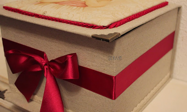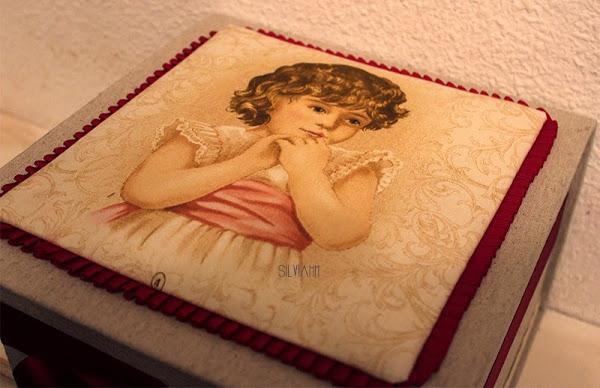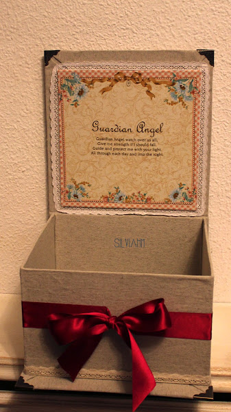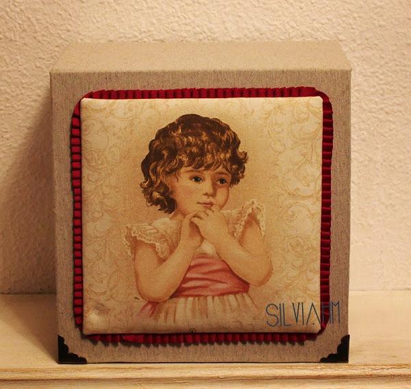 Hace un tiempo encontré esta tela y no me pude resistir. Era el último trozo que quedaba y empecé a darle vueltas a qué proyecto podría hacer con ella. En realidad es un panel con el que hacer un libro de oraciones en tela.Se trata de diseños vintage de niños, con su correspondiente hoja de oración,Ese será un proyecto futuro, pero como venían también algunas imágenes más, pensé en hacer una caja enteramente en lino, donde colocaría estas dos imágenes: En la tapa exterior, la niña, en el interior, la oración al Angel de la guarda. Como remates, unas puntillas muy sencillas y una tira plisada, además de un gran lazo decorativo y las nuevas cantoneras, preciosas.