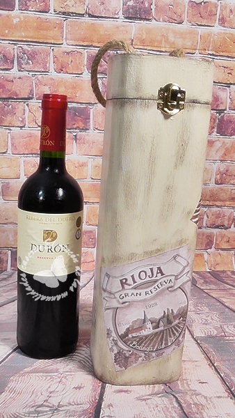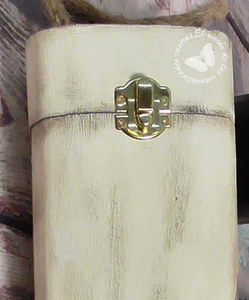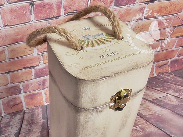 Una vez aplicada la pintura y seca con un pincel de estarcido y muy poquita pintura la he envejecido y por último decoupage con un papel de etiquetas de vinos muy adecuado para la caja.