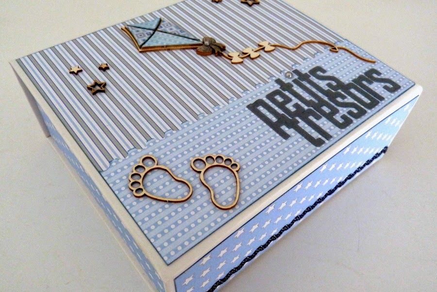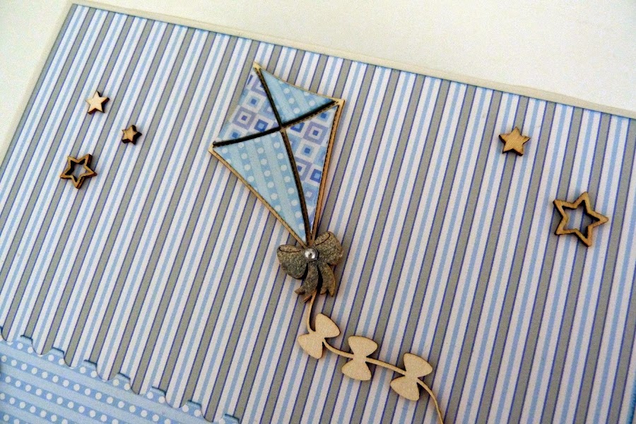 Los piececitos, las estrellas y la cometa son de madera y esta última la forré con papeles a juego y doble capa de glossy también.