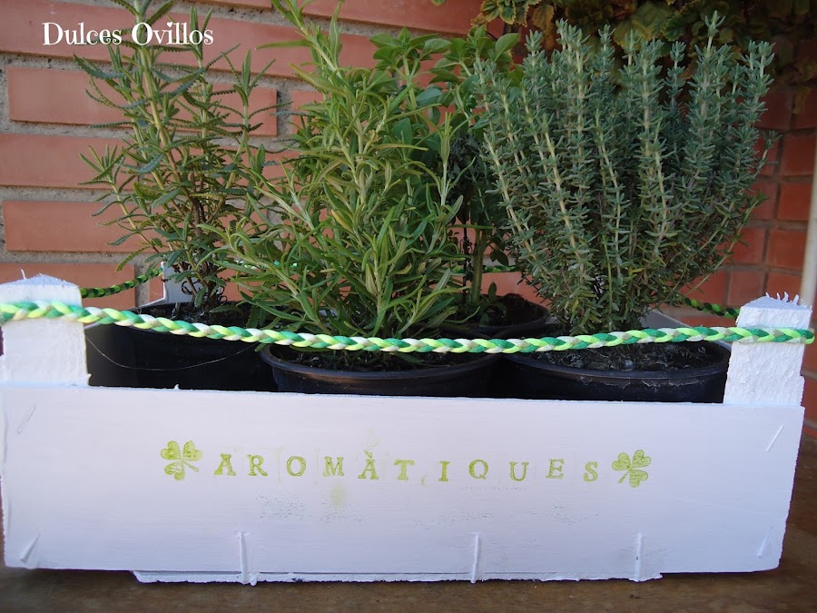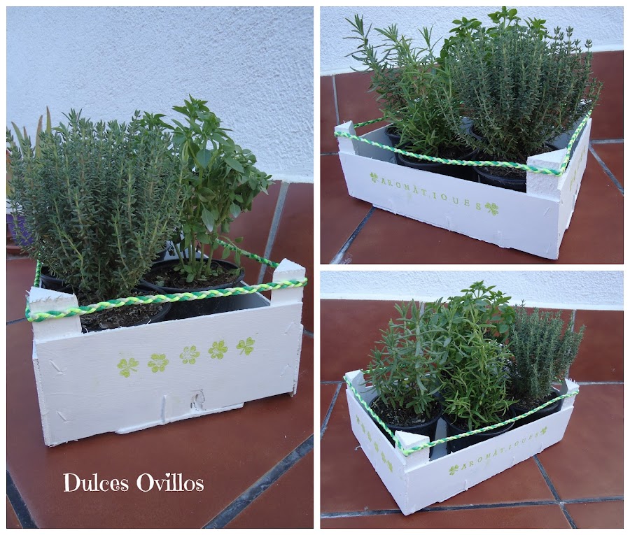 Como ves le he añadido un cordoncito que he pegado con silicona caliente, tambien he pensado impermeabilizarla por debajo con un plástico para que no coja humedad de las macetas. La menta no aparece porque no resiste el pleno sol como éstas y la tengo resguardada a sol y sombra.
