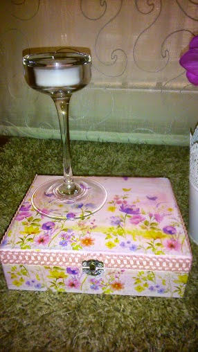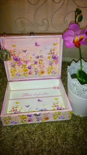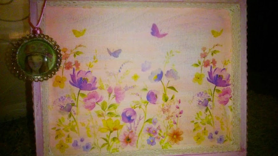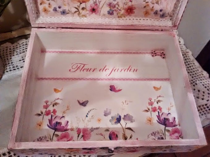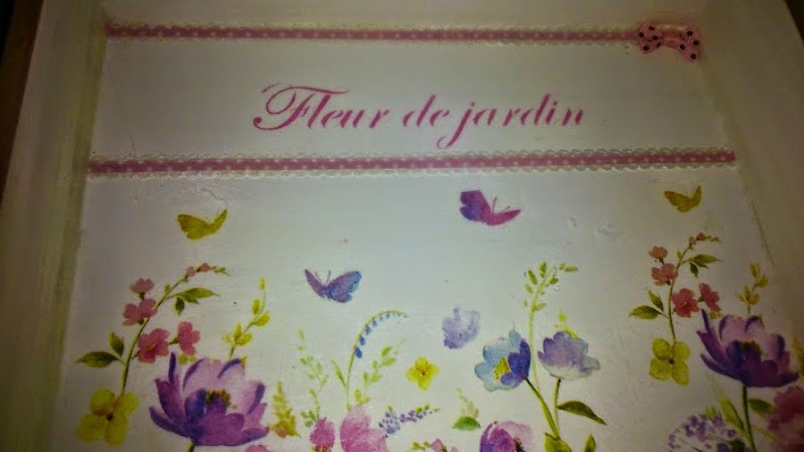 Le pegue una servilleta con motivos florares y en el fondo de la caja , le pinte con stencil unas letras