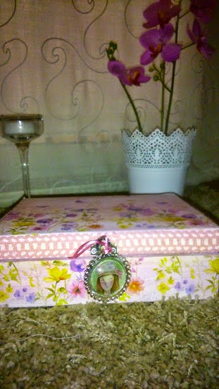 una vez terminada la servilleta, le pegué unos encaje por el contorno de la caja ,por fuera y por dentro de la tapa